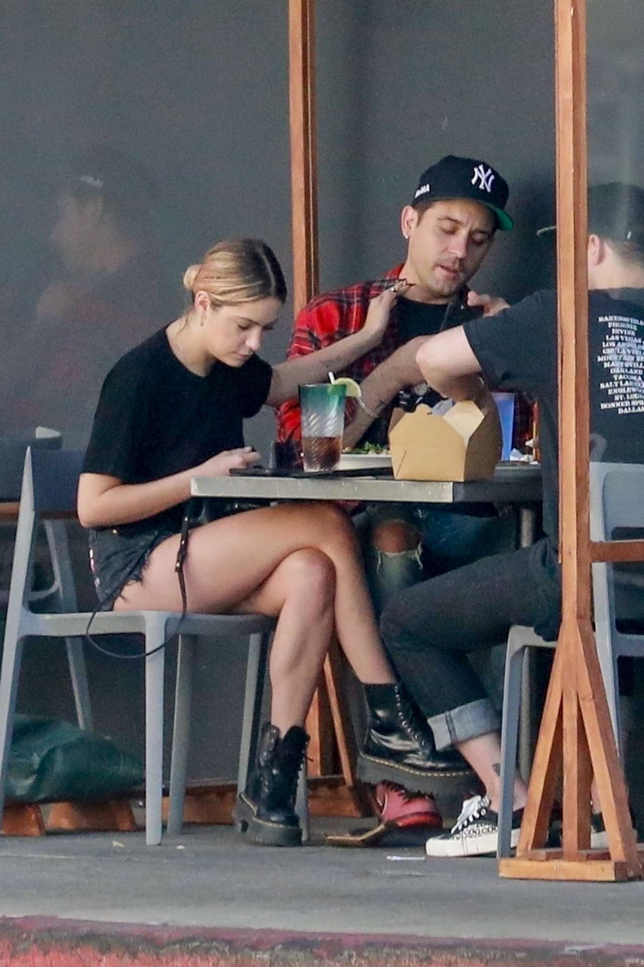 Los Angeles, CA – *EXCLUSIVE* Ashley Benson shows off her legs during lunch with boyfriend G-Eazy a friend at Mustard Seed Cafe in Los Angeles.