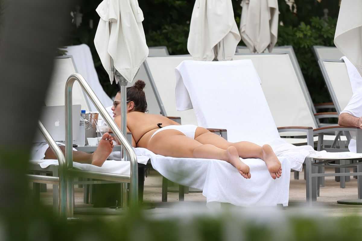 Ashley Graham in a White Bikini at a Pool in Miami