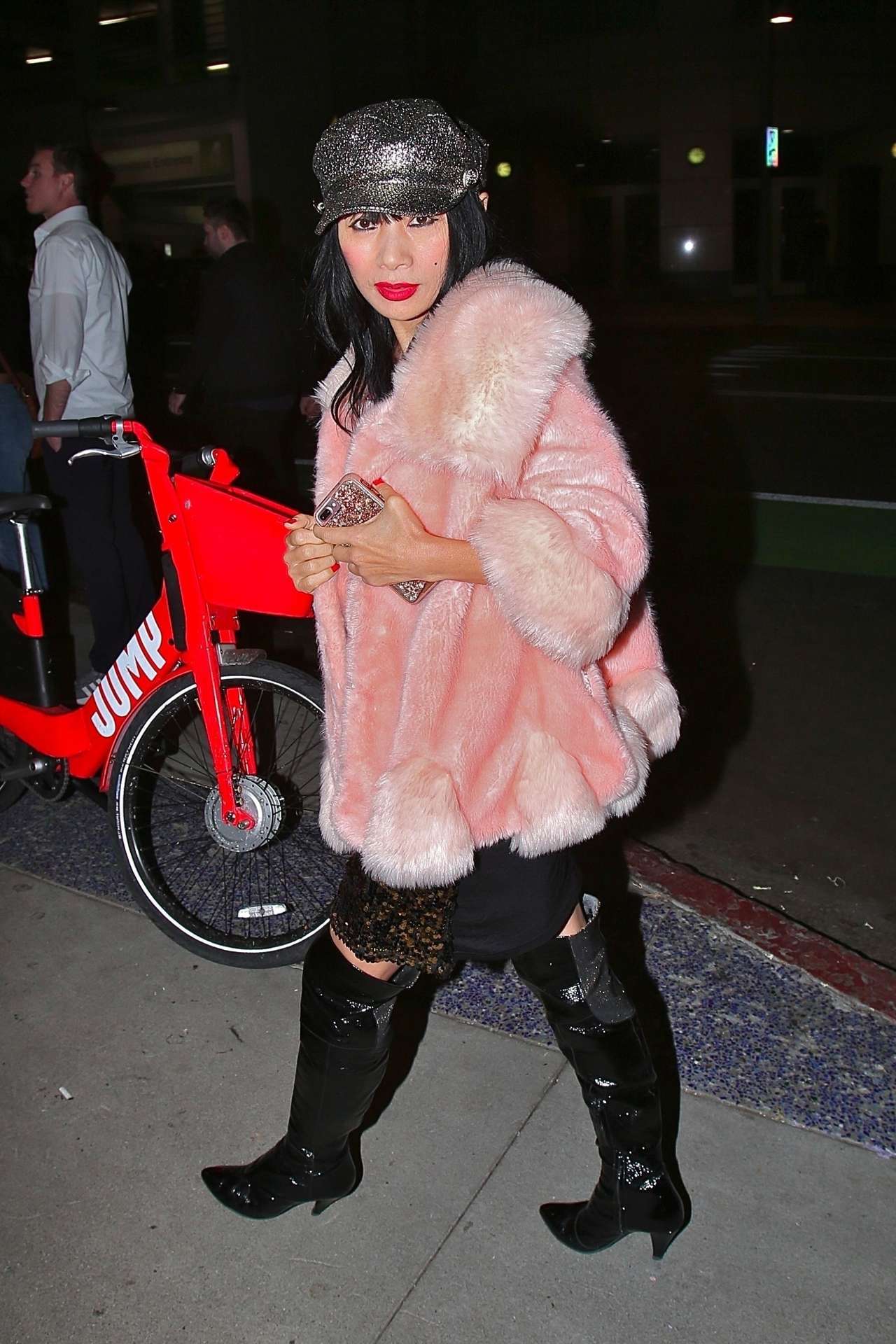 Santa Monica, CA – *EXCLUSIVE* – Possible new couple alert? Actress Bai Ling spotted with Joanna Krupa’s ex Nico Santucci as they arrive together for a date night dinner at Elephante restaurant in Santa Monica. The eclectic actress struck a pose for cameras, showing off her slim figure and fashion style in a sequined black minidress and black thigh-high boots with a fuzzy pink coat.