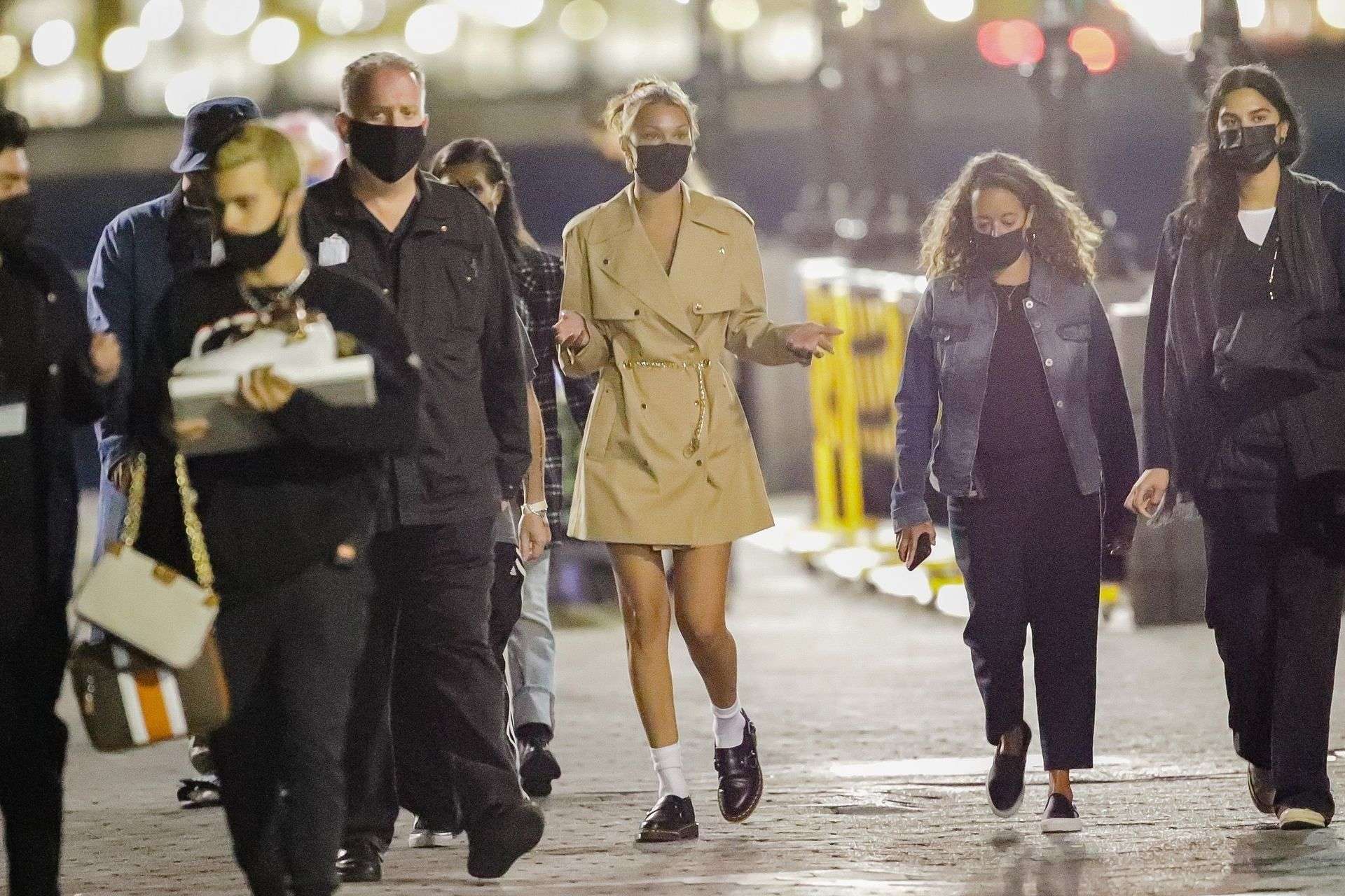 Bella Hadid Cleavage while wearing a Michael Kors Trench Coat Dress in New York