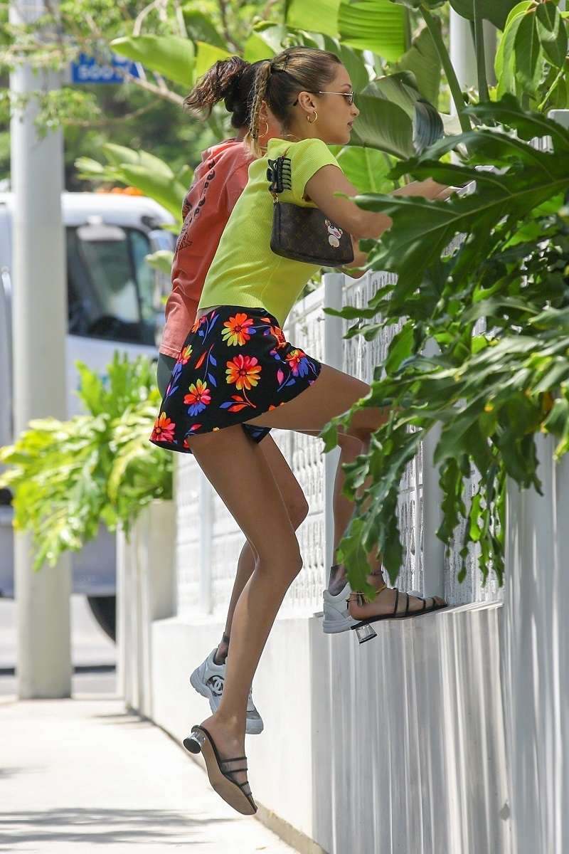 West Hollywood, CA – Bella Hadid and a friend jump over a fence as they arrive at someone’s apt this afternoon in L.A.