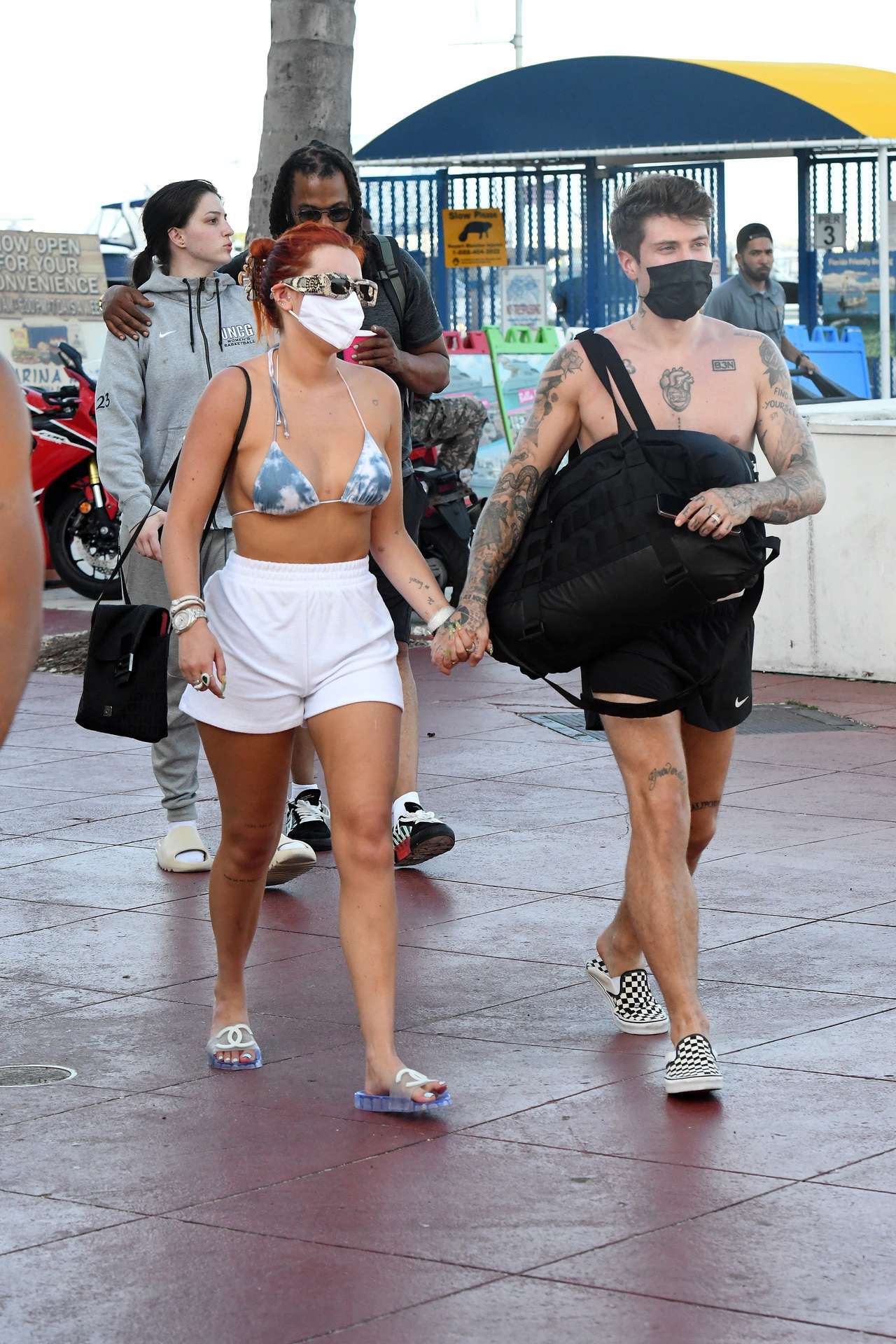 EXCLUSIVE: Actress Bella Thorne wears a blue and white bikini as she holds hands with fiancé Benjamin Mascolo while getting off a yacht in Miami.