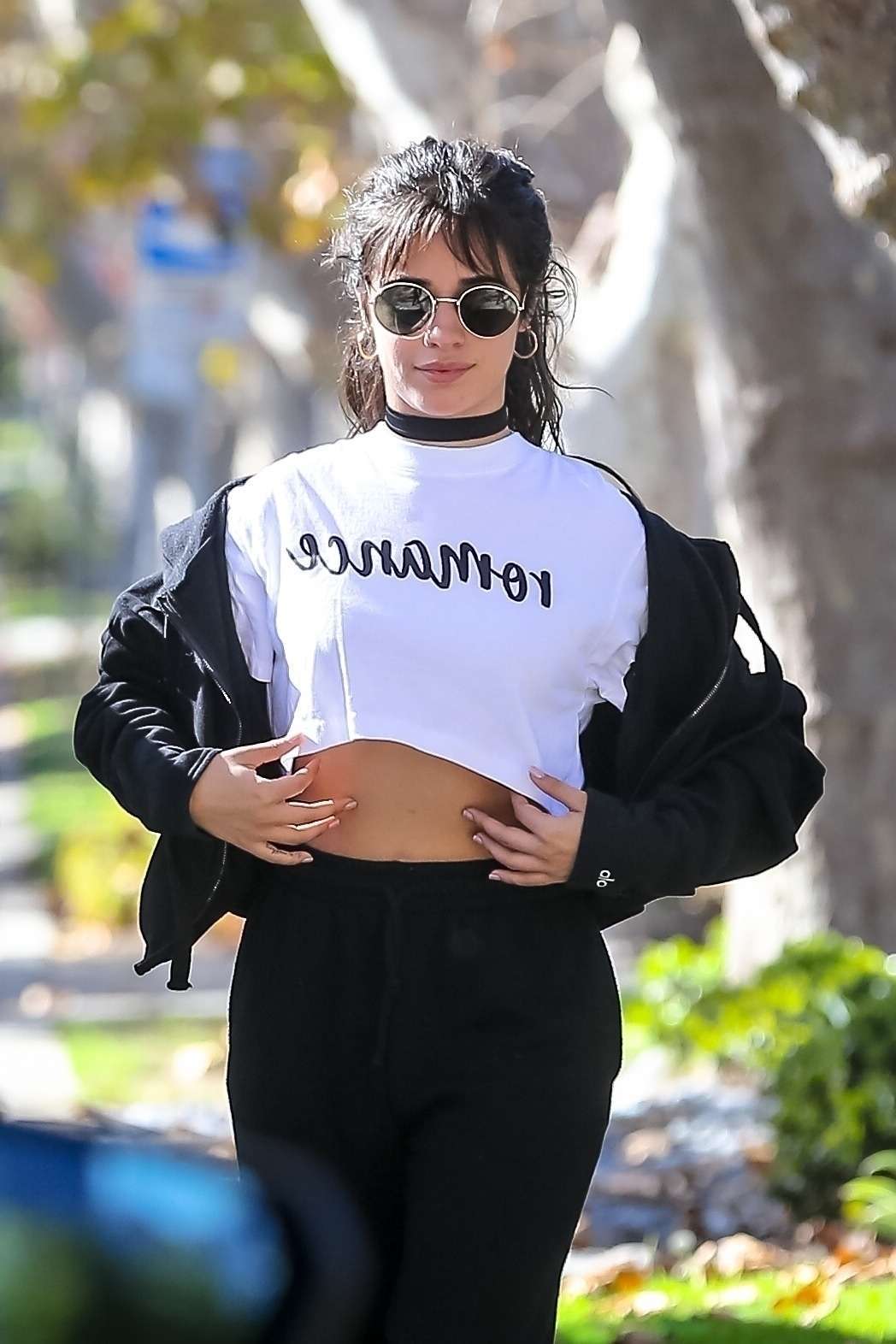 Studio City, CA – *EXCLUSIVE* Camila Cabello shows off her tummy as she strikes a pose promoting her new album ‘Romance’ while visiting friends with her mother in Studio City.