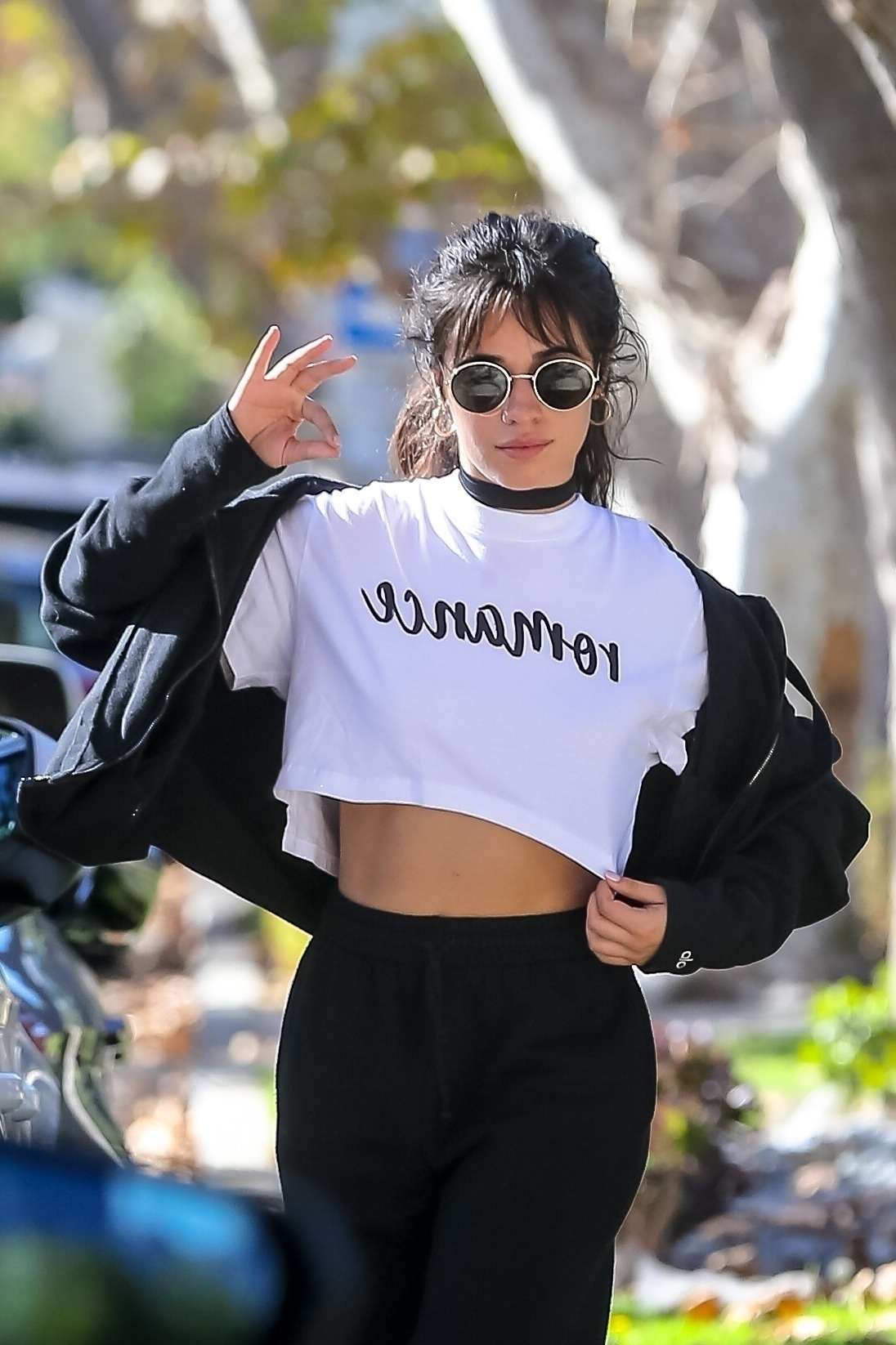 Studio City, CA – *EXCLUSIVE* Camila Cabello shows off her tummy as she strikes a pose promoting her new album ‘Romance’ while visiting friends with her mother in Studio City.