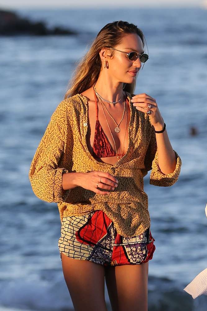 EXCLUSIVE: Model Candice Swanepoel wears a red snakeskin bikini from her own line, Tropic of C, as she takes a walk on the beach with a friend in Miami.