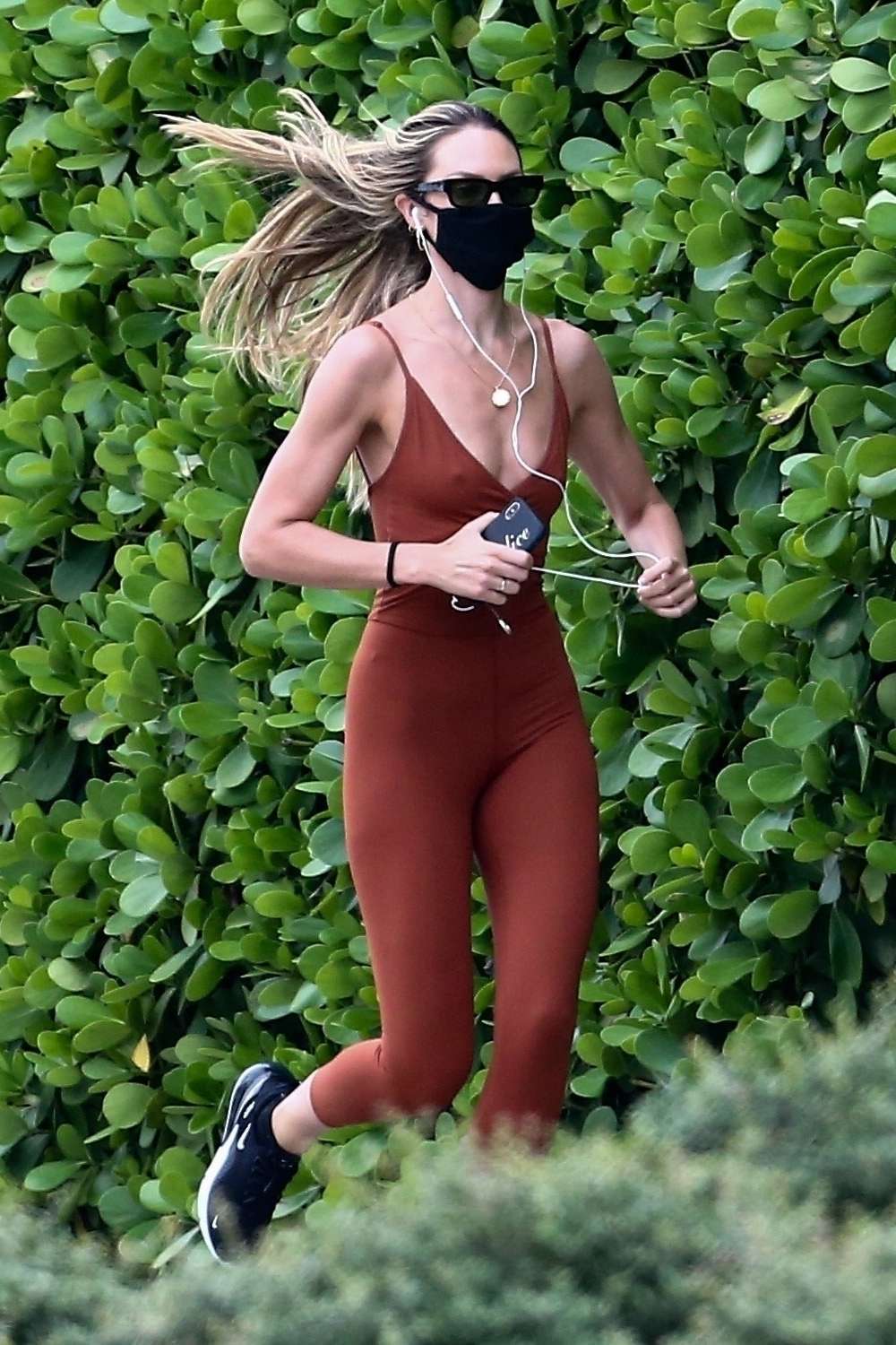 Miami, FL – *EXCLUSIVE* – Supermodel Candice Swanepoel steps out to go for a run despite the falling rain in Miami today. The South African beauty wore a maroon bodysuit and mask for safety during her run along with a male friend.