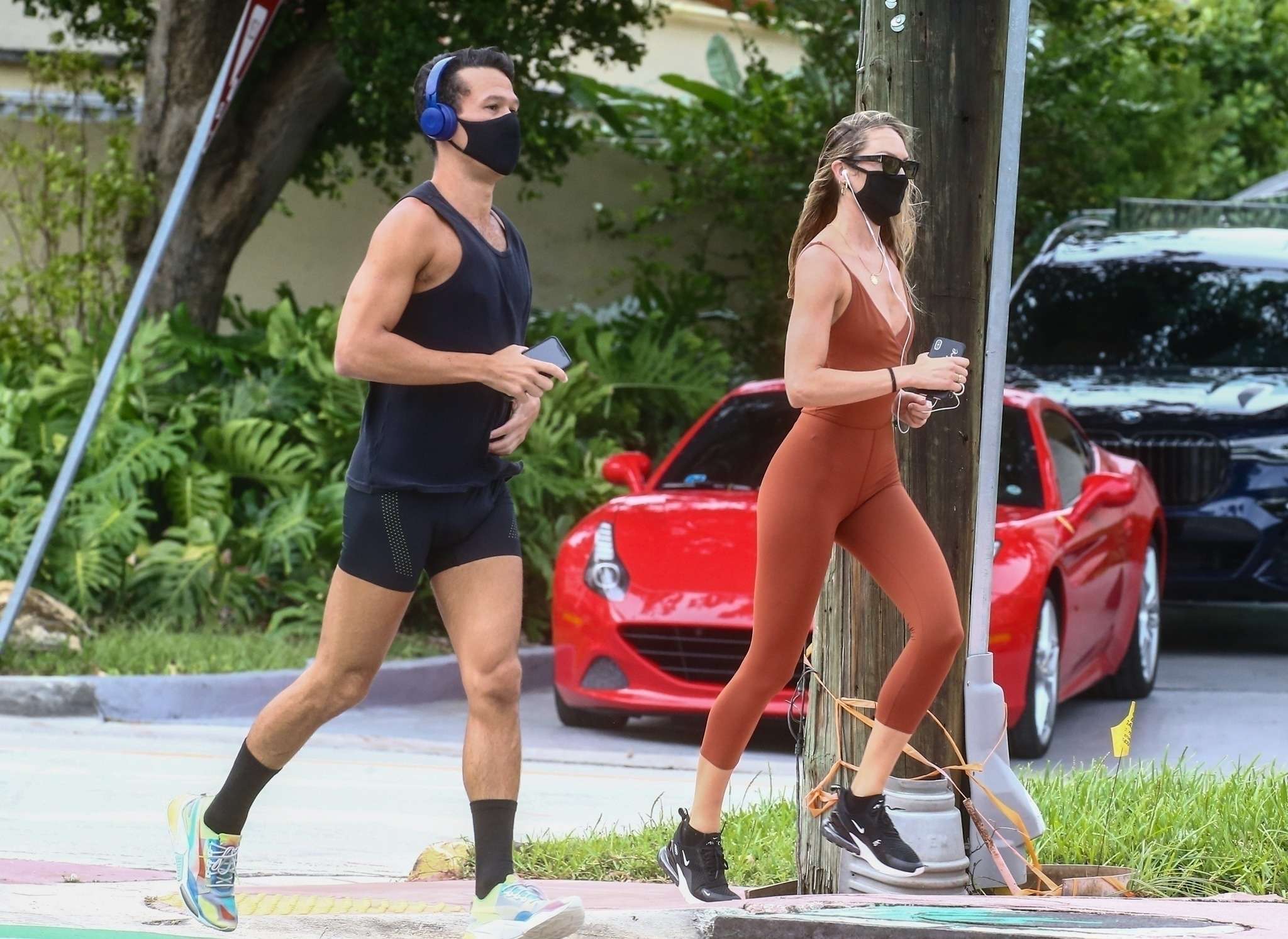 Miami, FL – *EXCLUSIVE* – Supermodel Candice Swanepoel steps out to go for a run despite the falling rain in Miami today. The South African beauty wore a maroon bodysuit and mask for safety during her run along with a male friend.