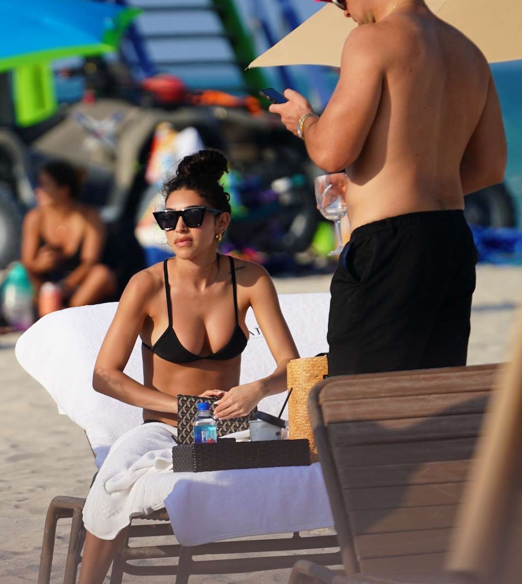 American model and DJ Chantel Jeffries in a black bikini at the beach of The Setai hotel. Chantel was relaxing at the beach with a mystery man and a female friend.