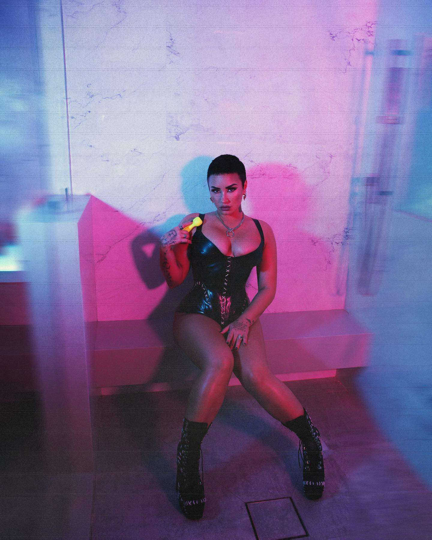 Attached to: Demi Lovato Leggy and Cleavage in Leather Outfit