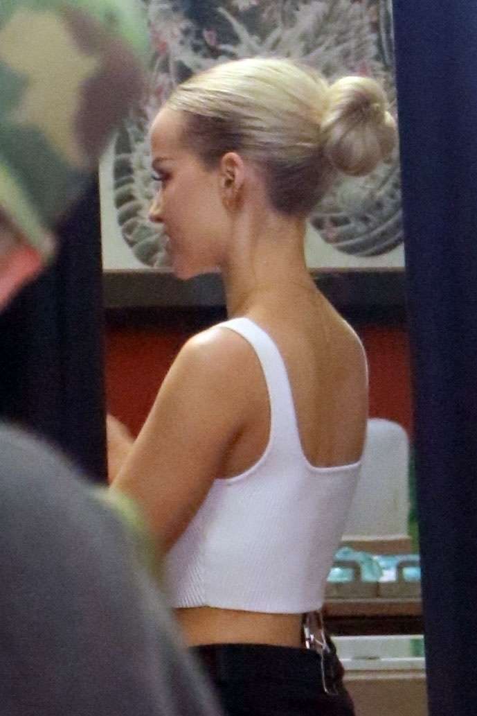 Los Angeles, CA – *EXCLUSIVE* – Dove Cameron shows off her fit figure in a white crop top tank while getting prepped for a new tattoo and filming a scene at a local tattoo parlor on Thursday.