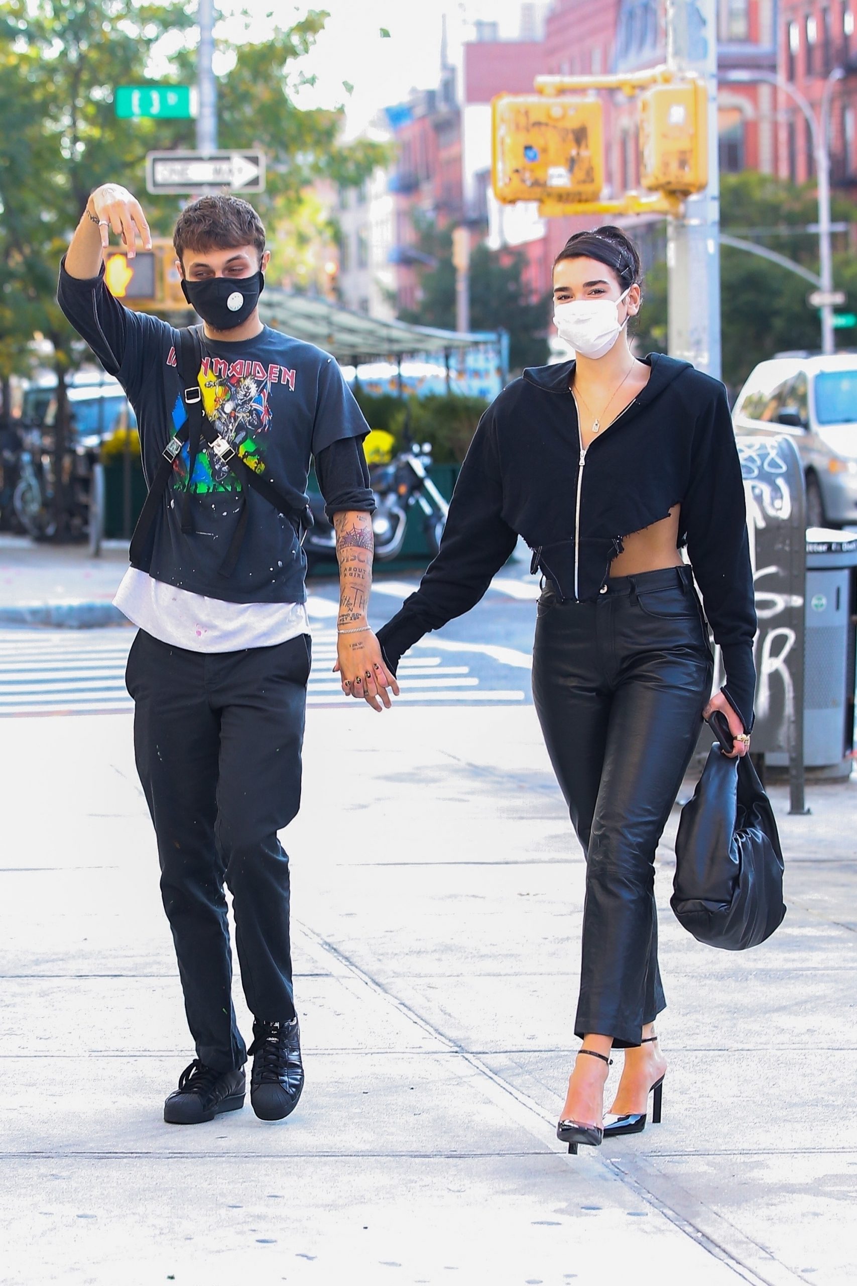 New York, NY – *EXCLUSIVE* Lovebirds Dua Lipa and Anwar Hadid seen smiling and holding hands in the Big Apple, New York. Dua shows off her curves in a crop top and high waisted leather pants.