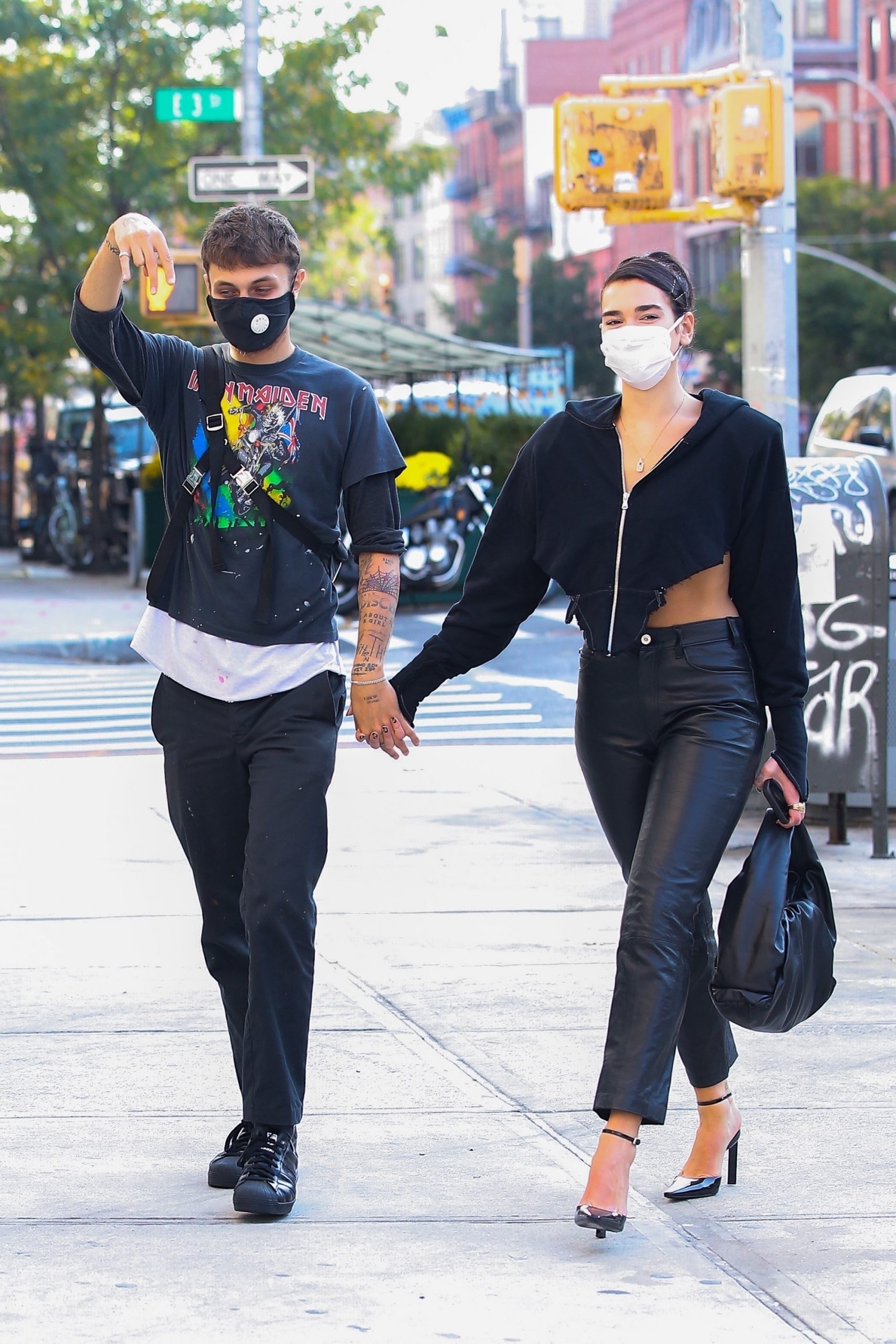 New York, NY – *EXCLUSIVE* Lovebirds Dua Lipa and Anwar Hadid seen smiling and holding hands in the Big Apple, New York. Dua shows off her curves in a crop top and high waisted leather pants.