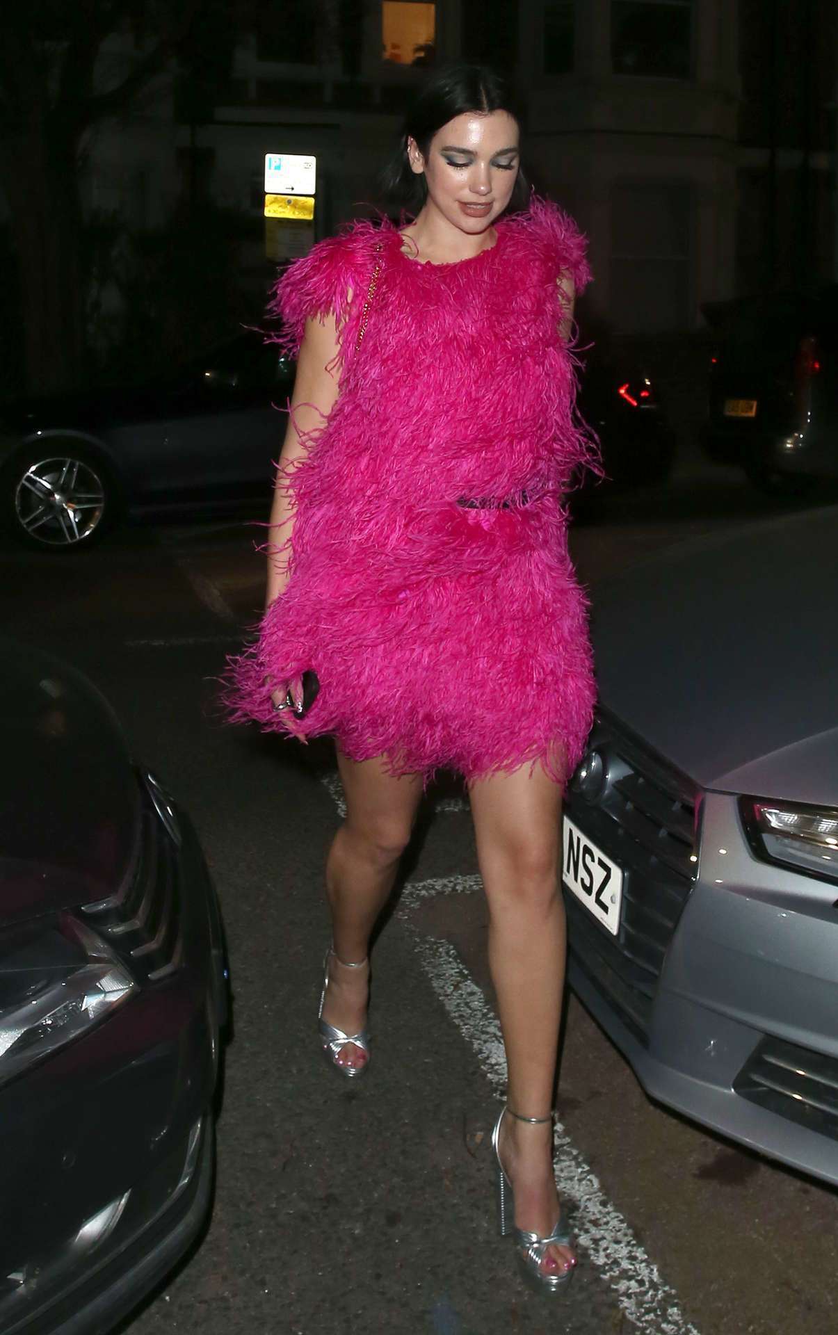 Dua is seen here at her boyfriend Isaac Carew Birthday Party.Dua looked fantastic in a short fluffy electric pink dress with a large pair of silver high heels whilst Isaac carried a large