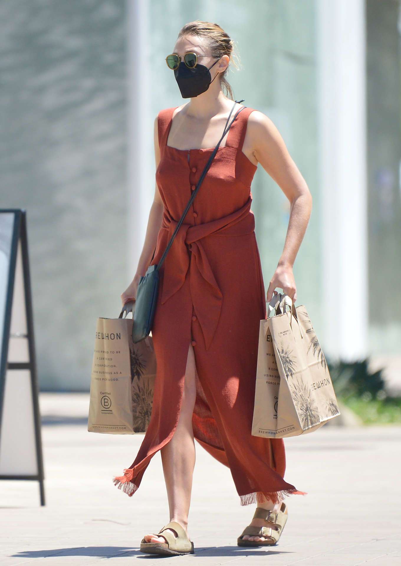 EXCLUSIVE: Elizabeth Olsen wears a long red summer dress while shopping for groceries at high-end health food store Erewhon Market in Los Angeles on Tuesday. 12 Jul 2022 Pictured: Elizabeth Olsen wears a red summer dress shopping for groceries in L.A. Photo credit: Garrett Press / MEGA TheMegaAgency.com +1 888 505 6342 (Mega Agency TagID: MEGA877326_001.jpg) [Photo via Mega Agency]
