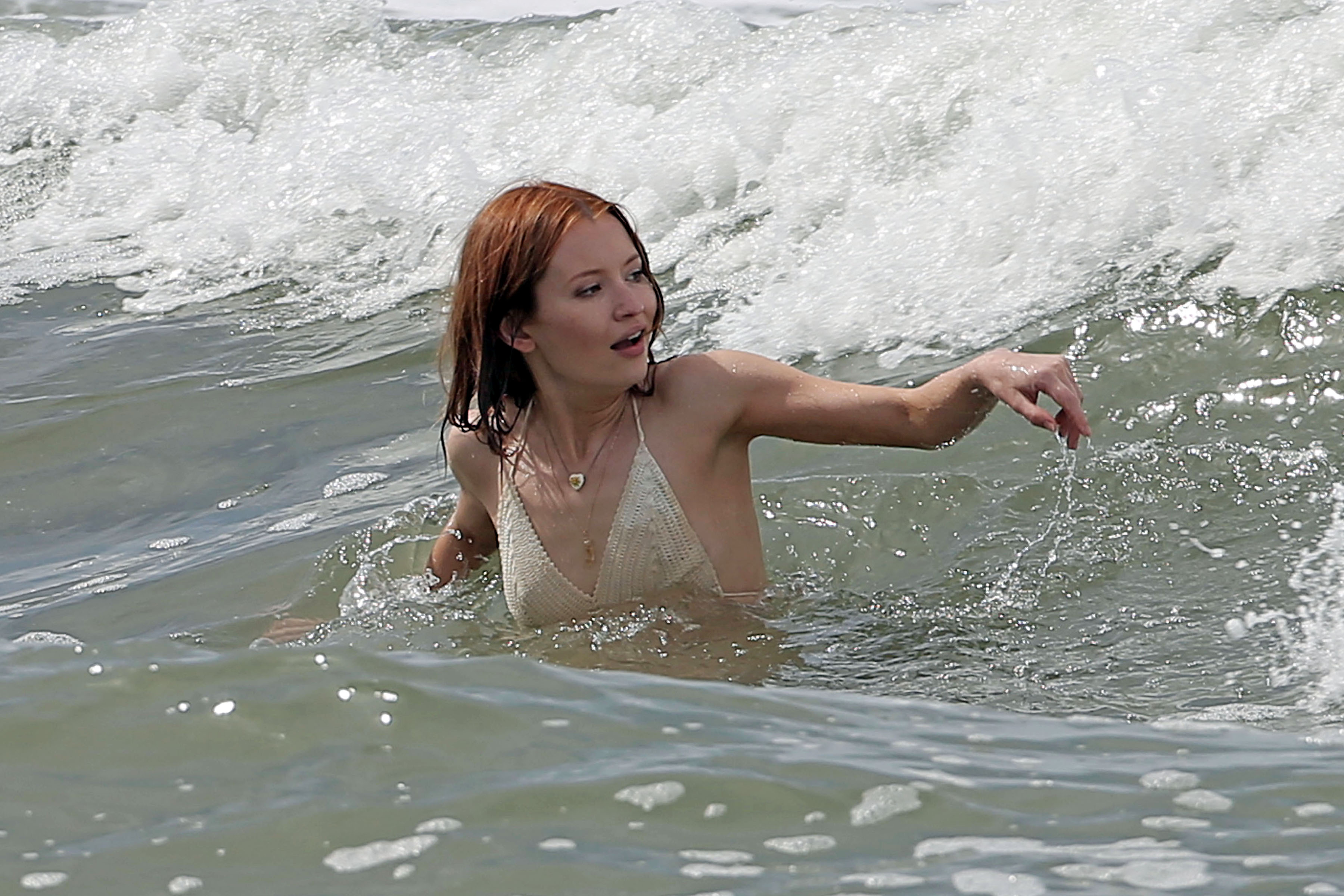 Emily Browning films a beach scene for "The Shangri-La Suite" in Los Angeles