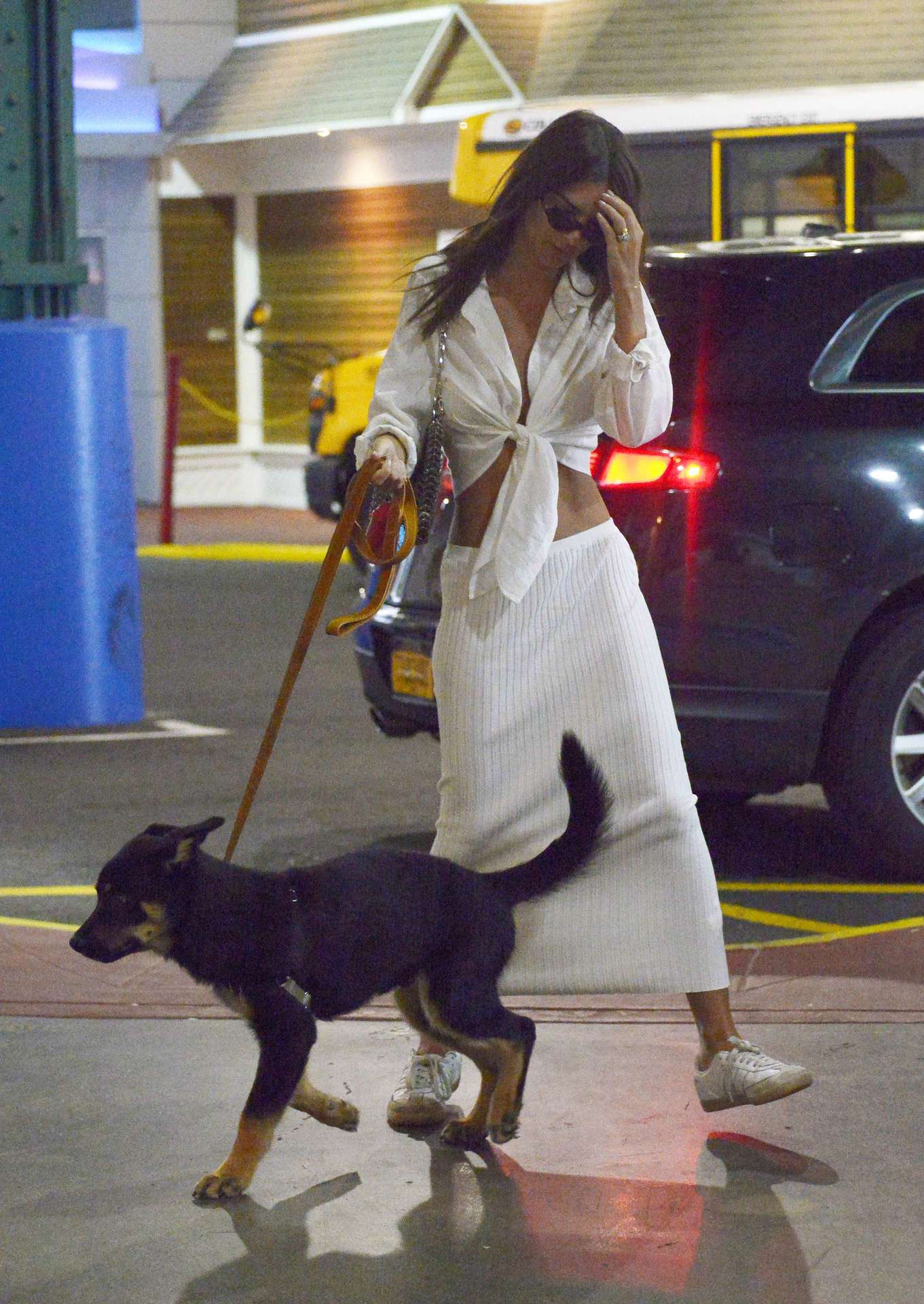 07/12/2019 Emily Ratajkowski is spotted stepping out with her dog in New York City. The 28 year old bikini model wore a white crop top, striped skirt, and white trainers.