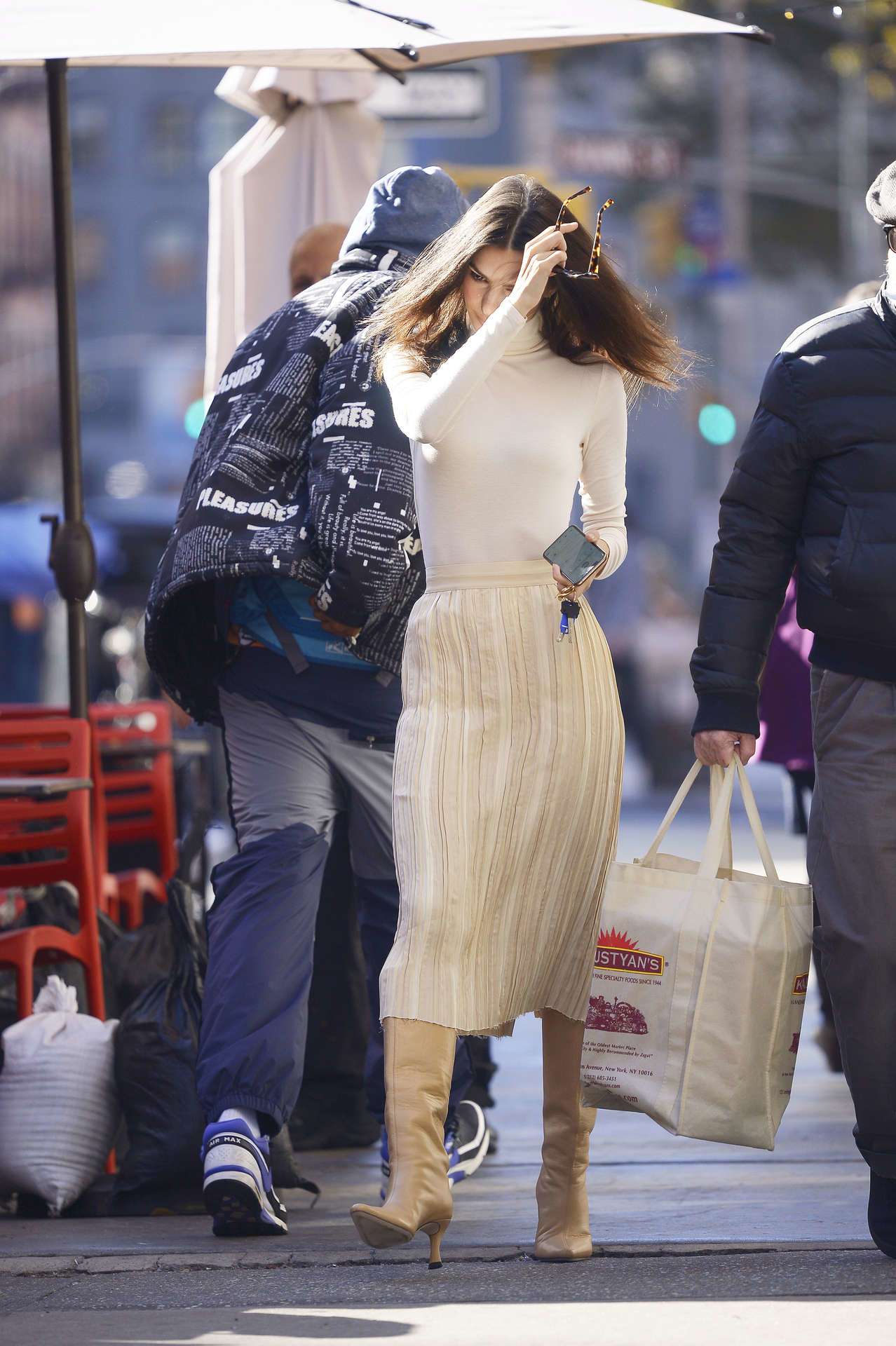 11/08/2021 Emily Ratajkowski cuts a dash on the streets of New York City. The 30 year old model and author headed out after a wardrobe change into a white turtleneck, pleated skirt, and tan boots.