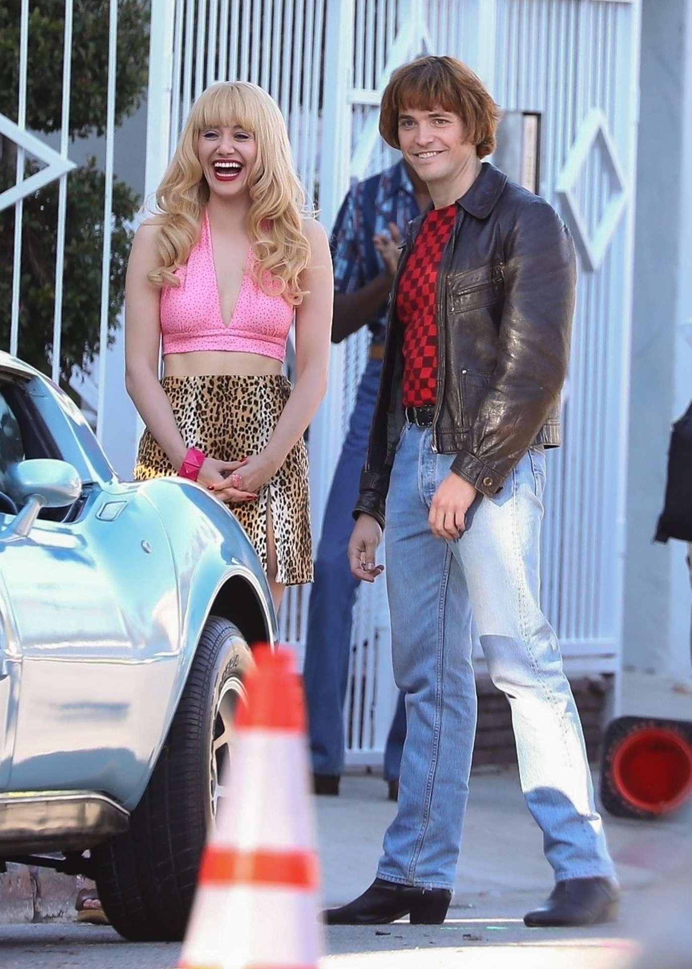 Los Angeles, CA – *EXCLUSIVE* Actress Emmy Rossum has a laugh while filming a scene for “Angelyne” in Los Angeles. In the scene, Angelyne receives a marriage proposal from her love interest after giving her a new baby blue Corvette.
