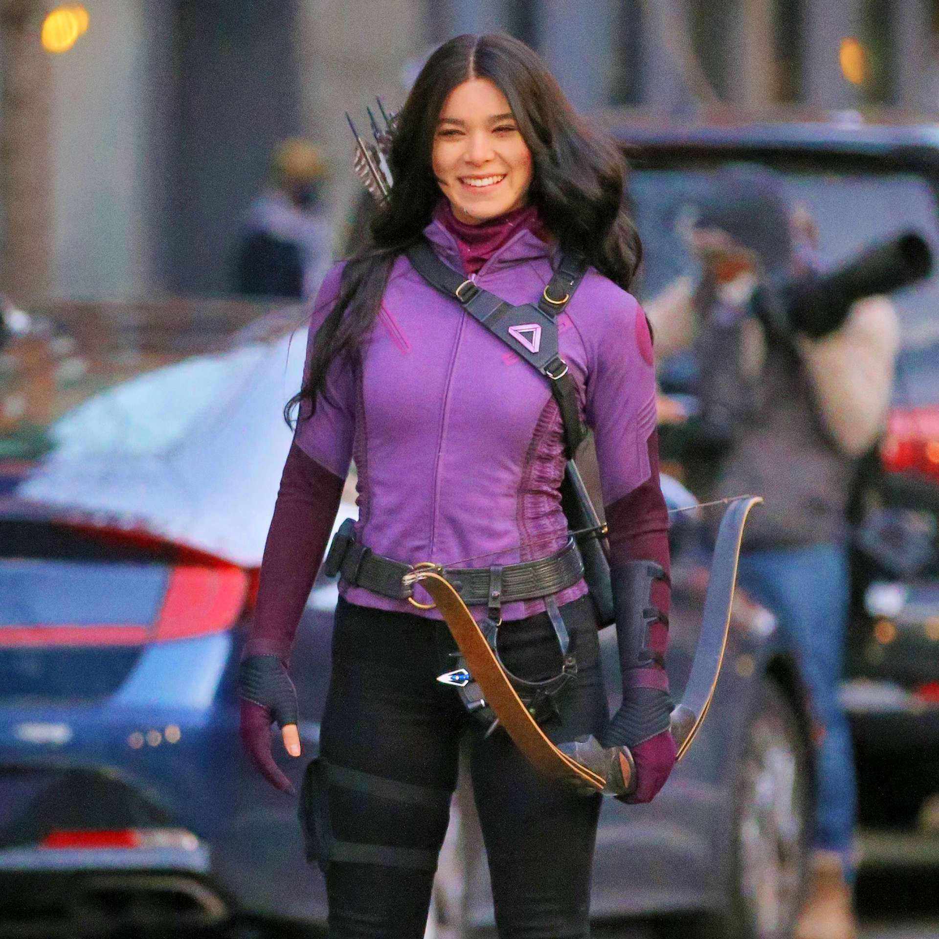 Actress Hailee Steinfeld and Jeremy Jeremy carry bows and arrows filming ‘Hawkeye’ in East Village in New York City. Hailee is wearing a tight purple top with black pants with a quiver of arrows on her back.