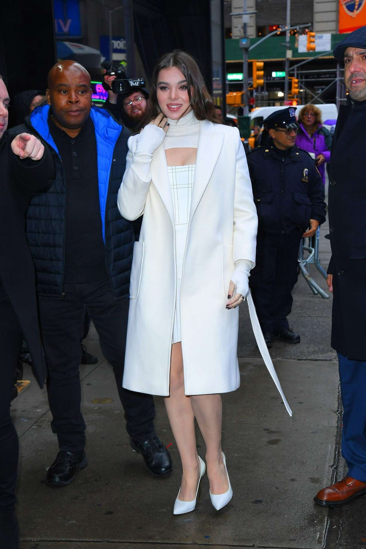 New York, NY – Hailee Steinfeld smiles at the crowd as she arrives at Good Morning America. Hailee looks great in all white for the outing.