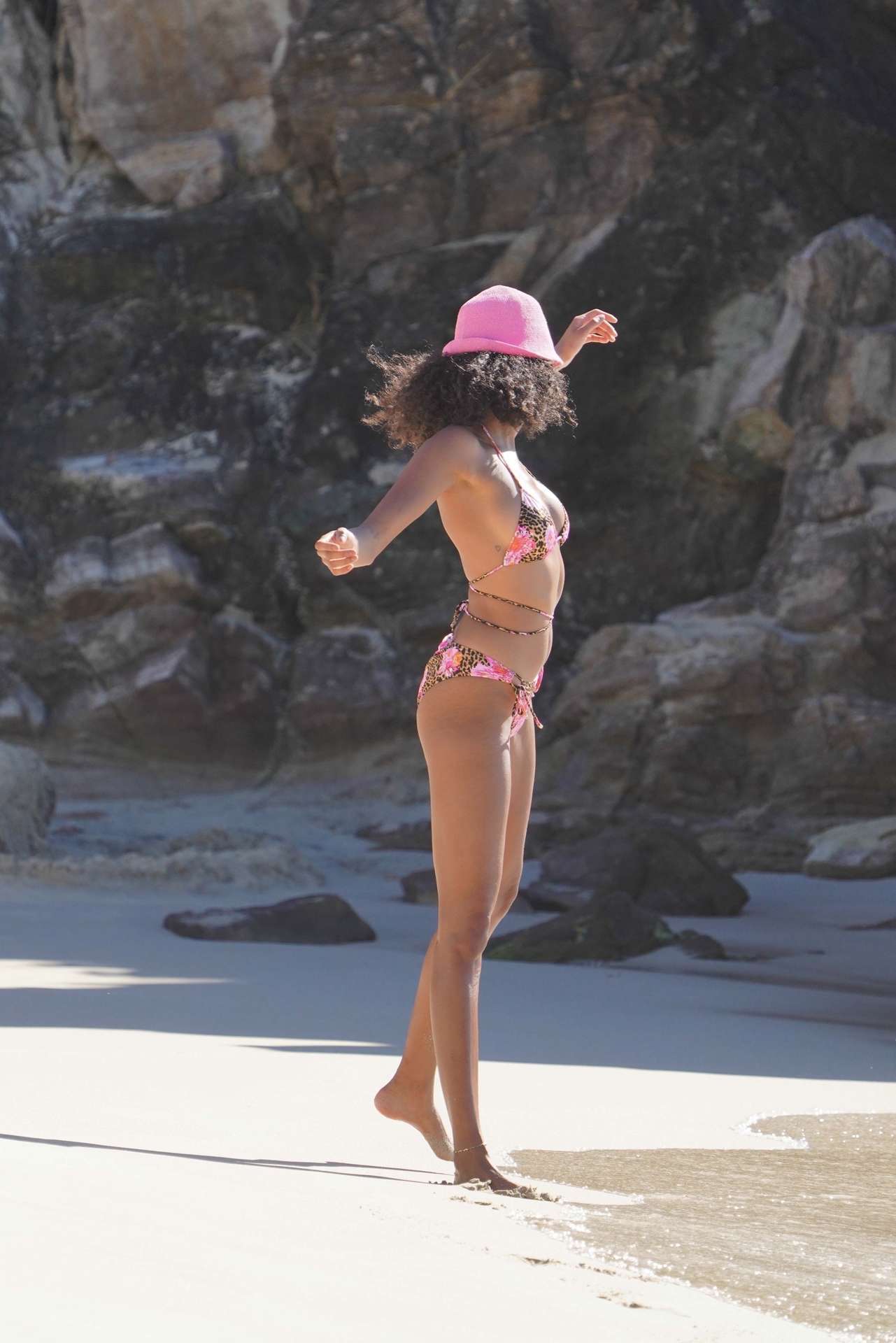 Saint Barthélemy, SAINT BARTHELEMY – *EXCLUSIVE* – Dutch Model Imaan Hammam shows off her curves in an animal print bikini while out posing for photos on a beach for a Victoria’s Secret shoot in St. Barts.