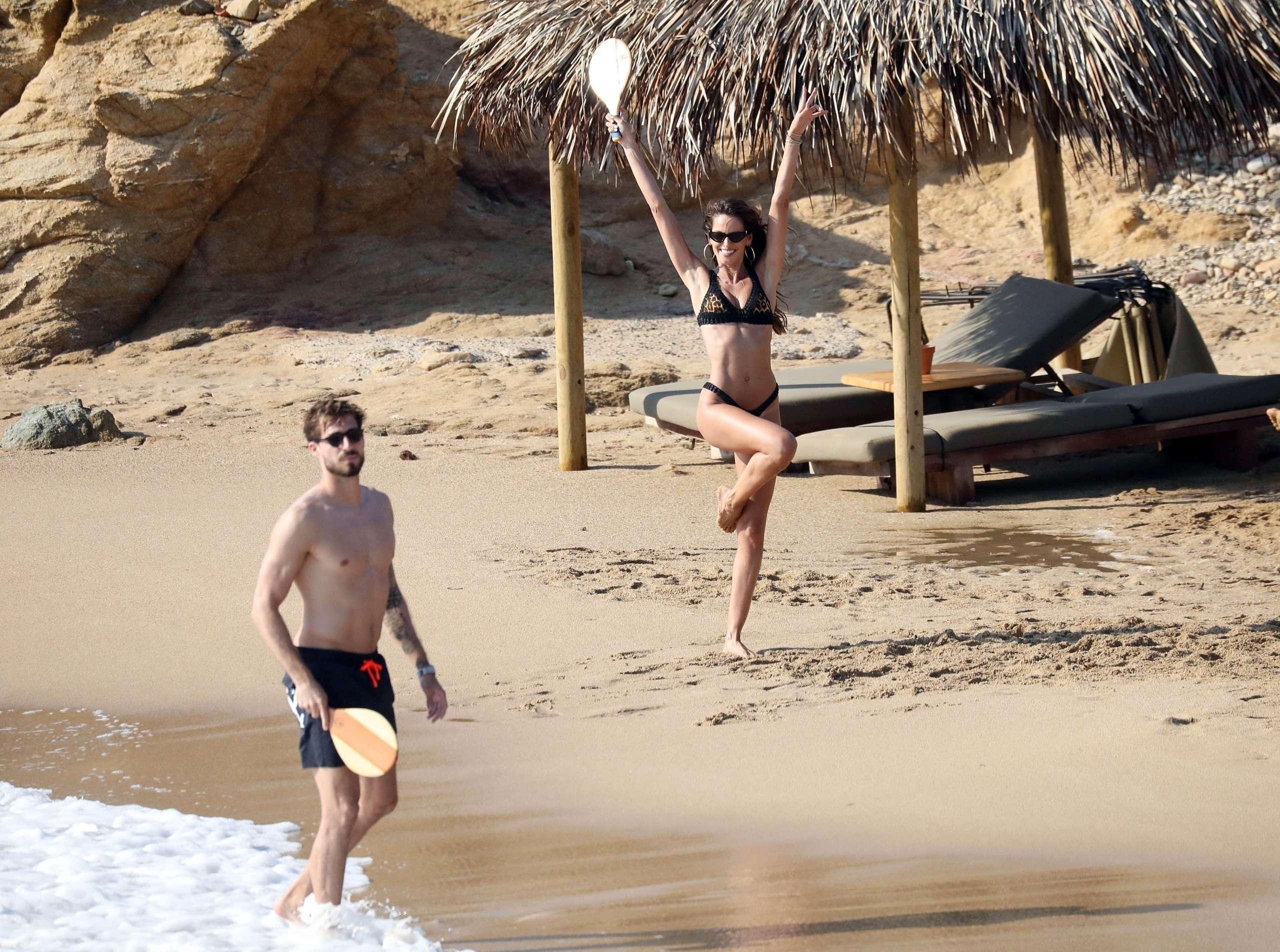 Izabel Goulart and Kevin Trapp pictured enjoying some Beach paddle ball in Mykonos