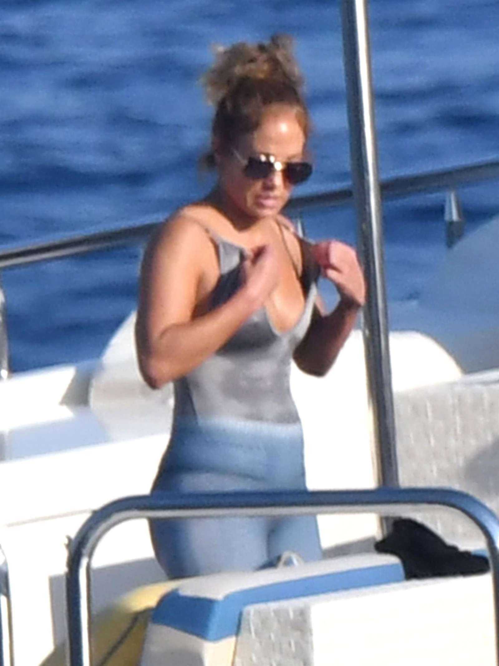 Jennifer Lopez in Green Swimsuit on a Yacht in Italy