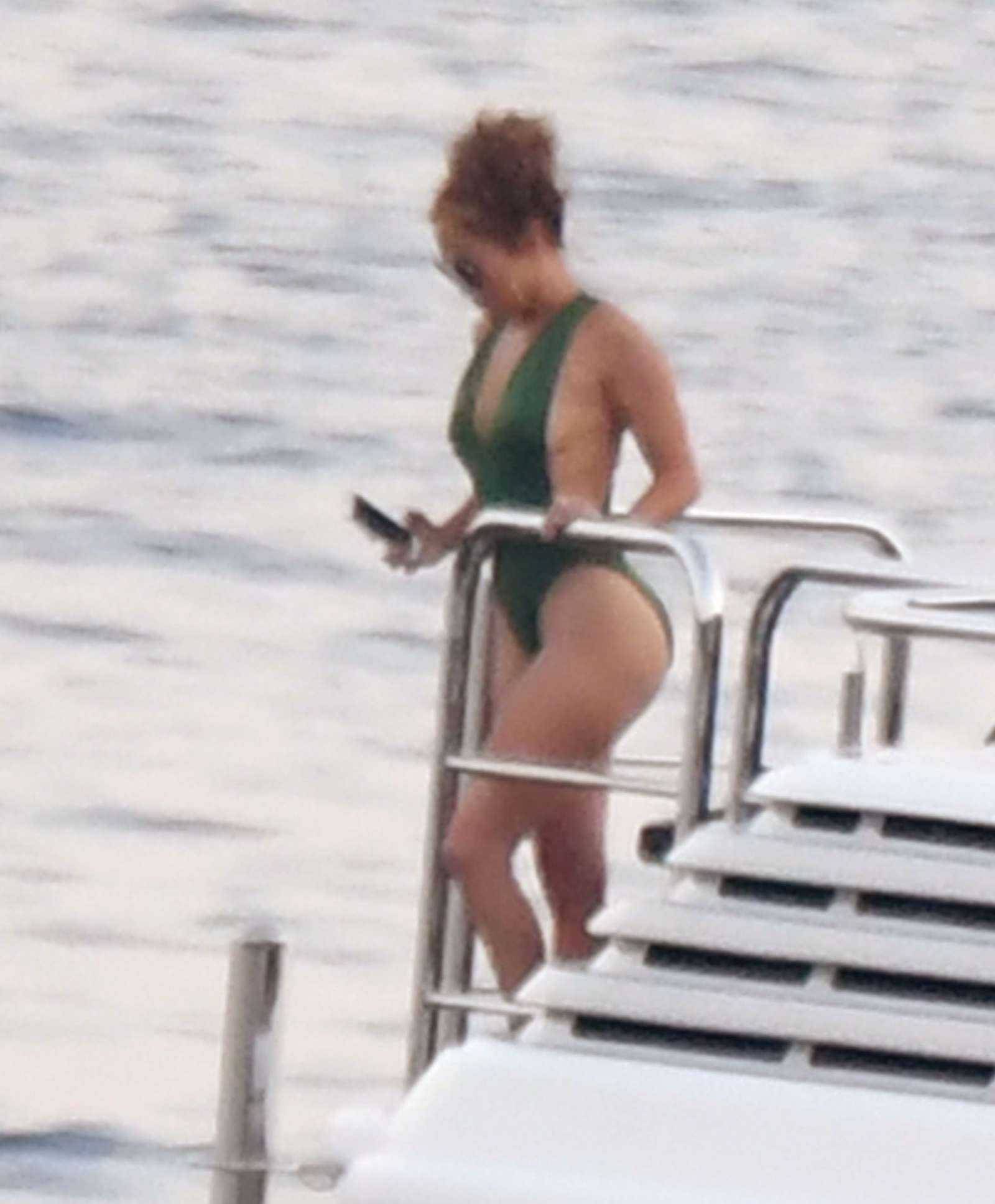 Jennifer Lopez in Green Swimsuit on a Yacht in Italy