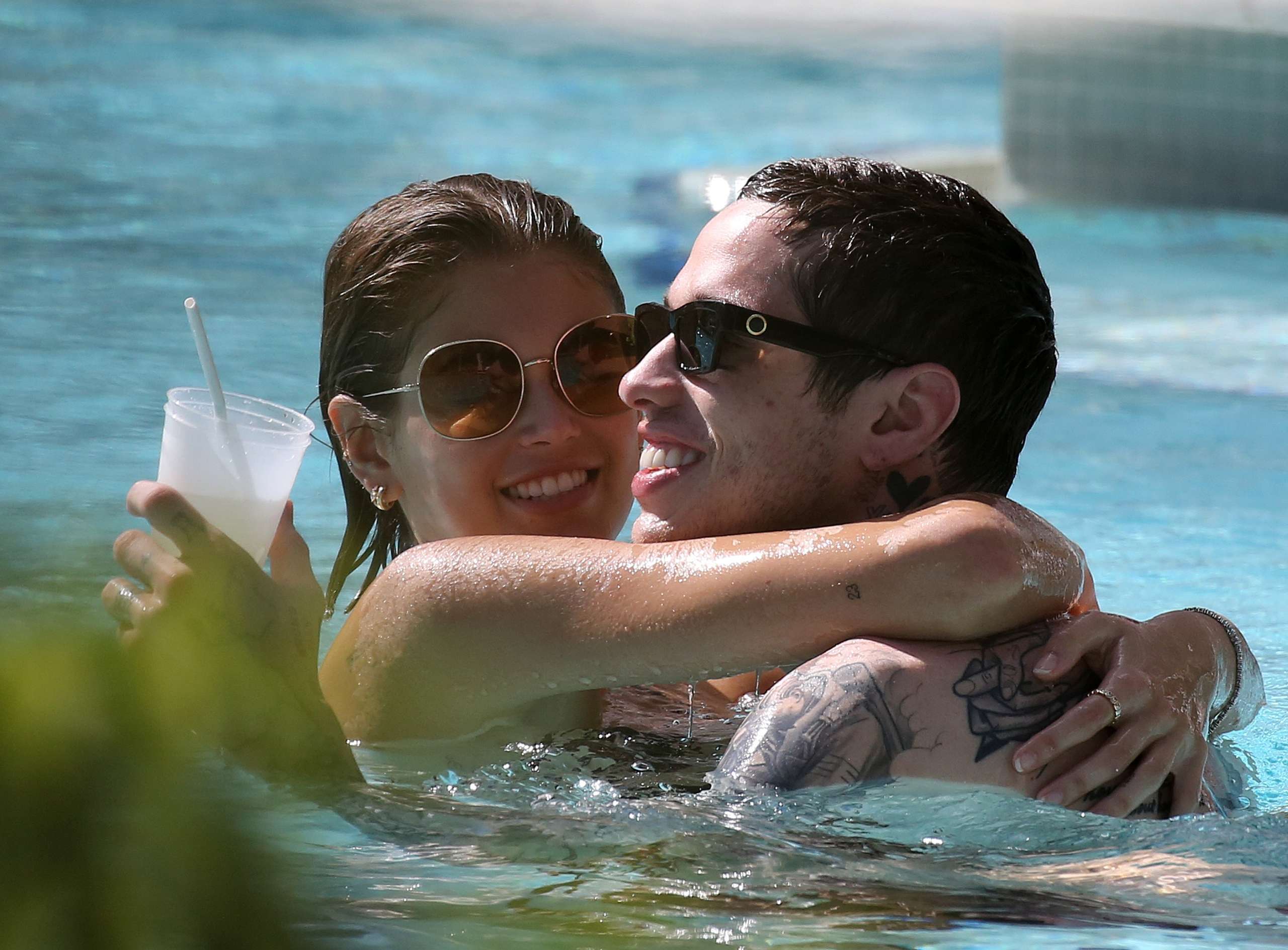 Kaia Gerber and boyfriend Pete Davidson can’t stop kissing as they take a dip in the pool in Miami.