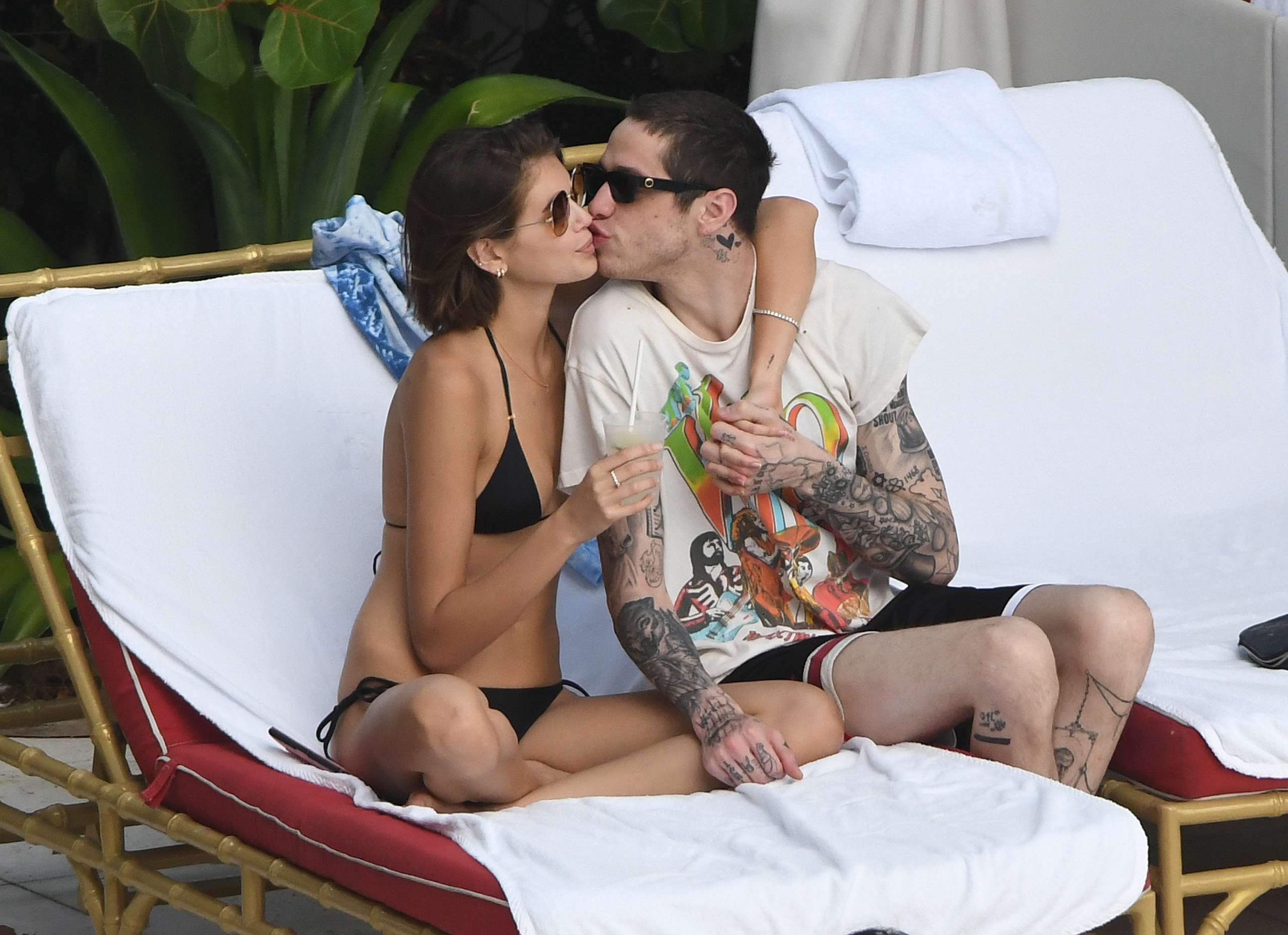 Kaia Gerber wears a black bikini as she makes out with boyfriend Pete Davidson by the pool in Miami.