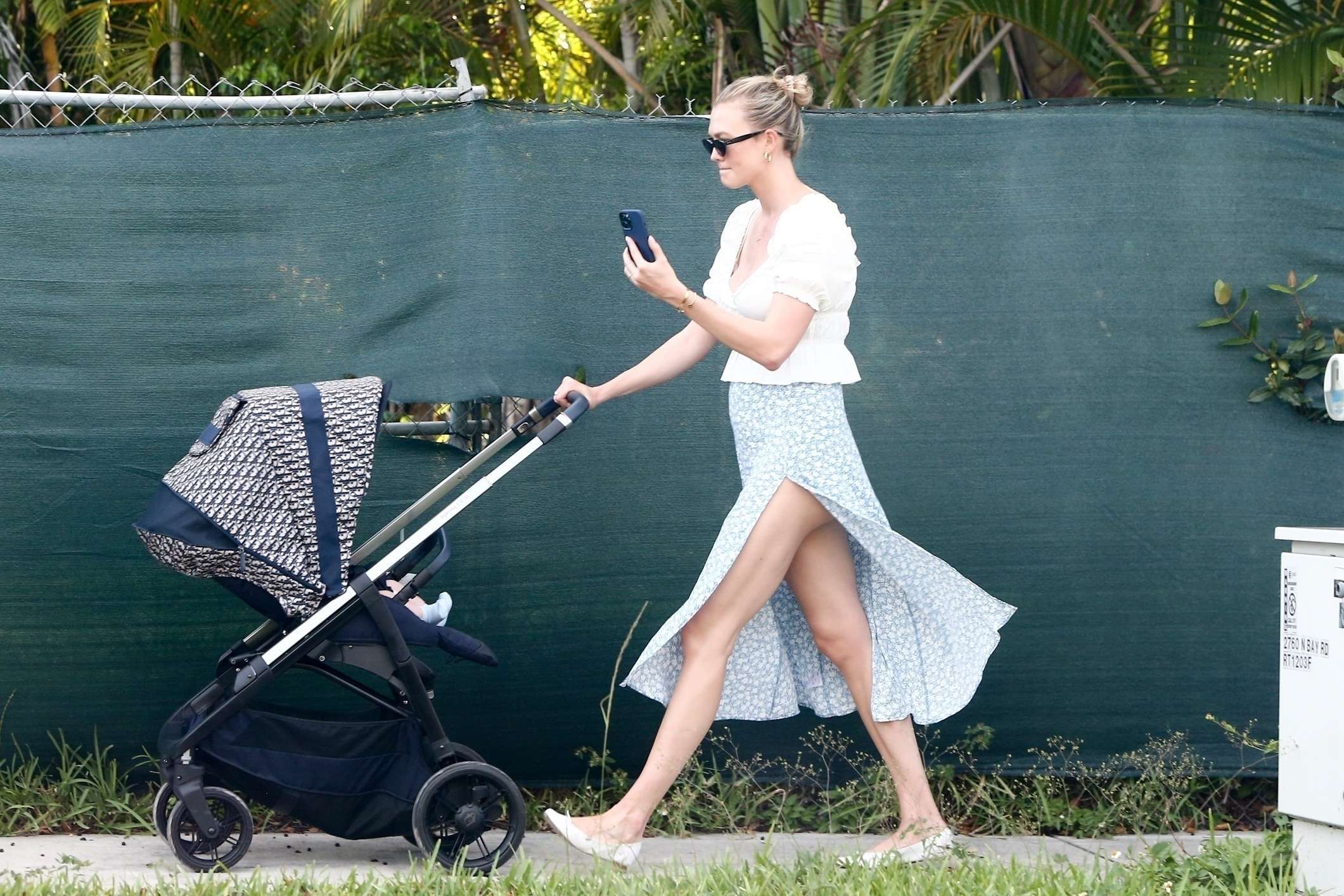 Miami, FL – *EXCLUSIVE* Karlie Kloss shows some leg as she goes out for a walk with her newborn baby boy Levi Joseph in Miami, Florida.