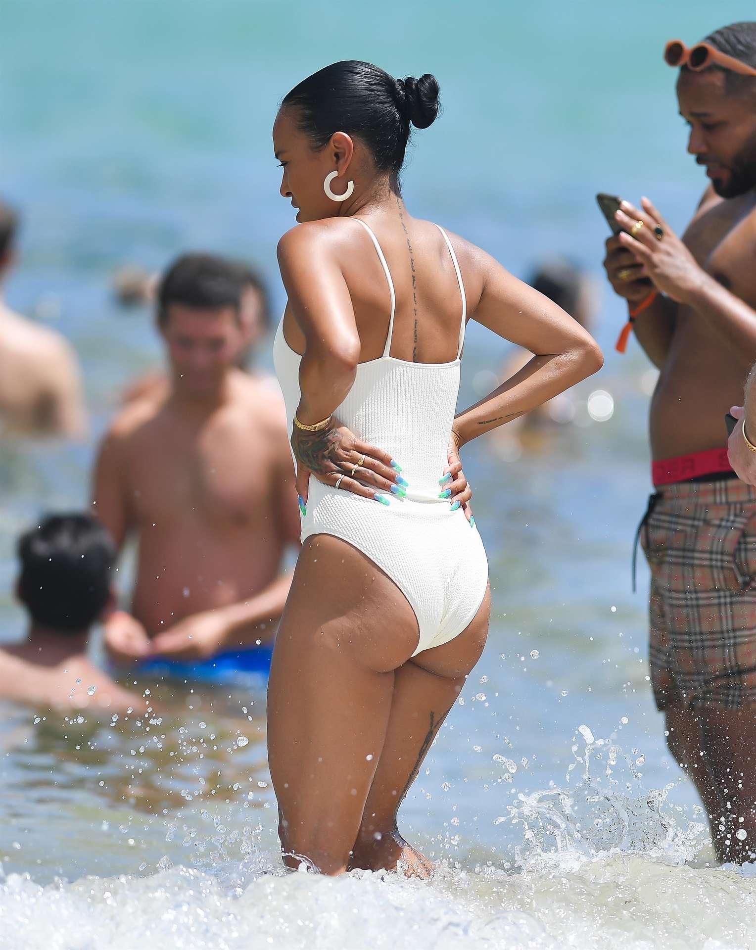 Karrueche Tran looks incredible in a white one-piece swimsuit while in Miami with friends enjoying the warm weather