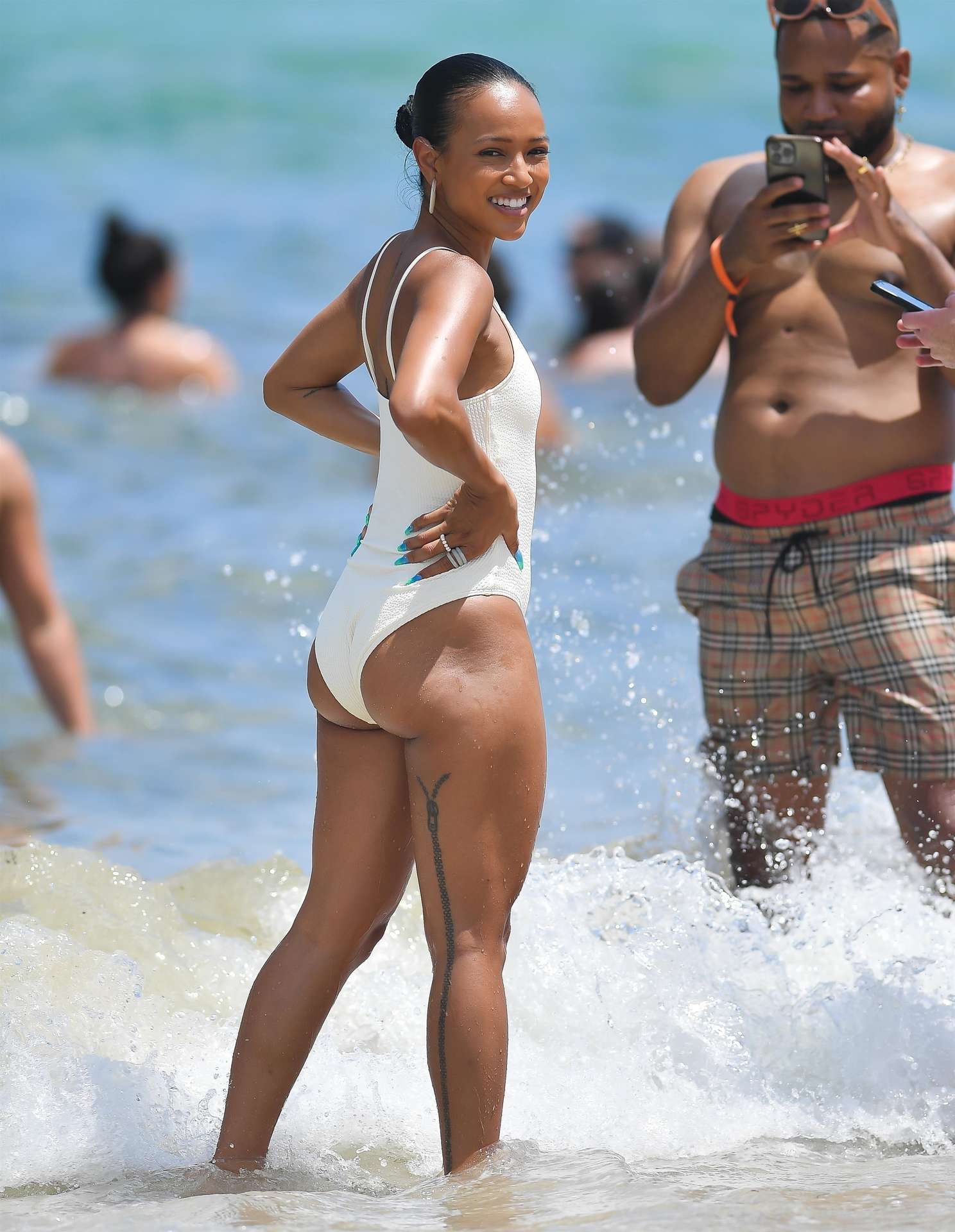 Karrueche Tran looks incredible in a white one-piece swimsuit while in Miami with friends enjoying the warm weather