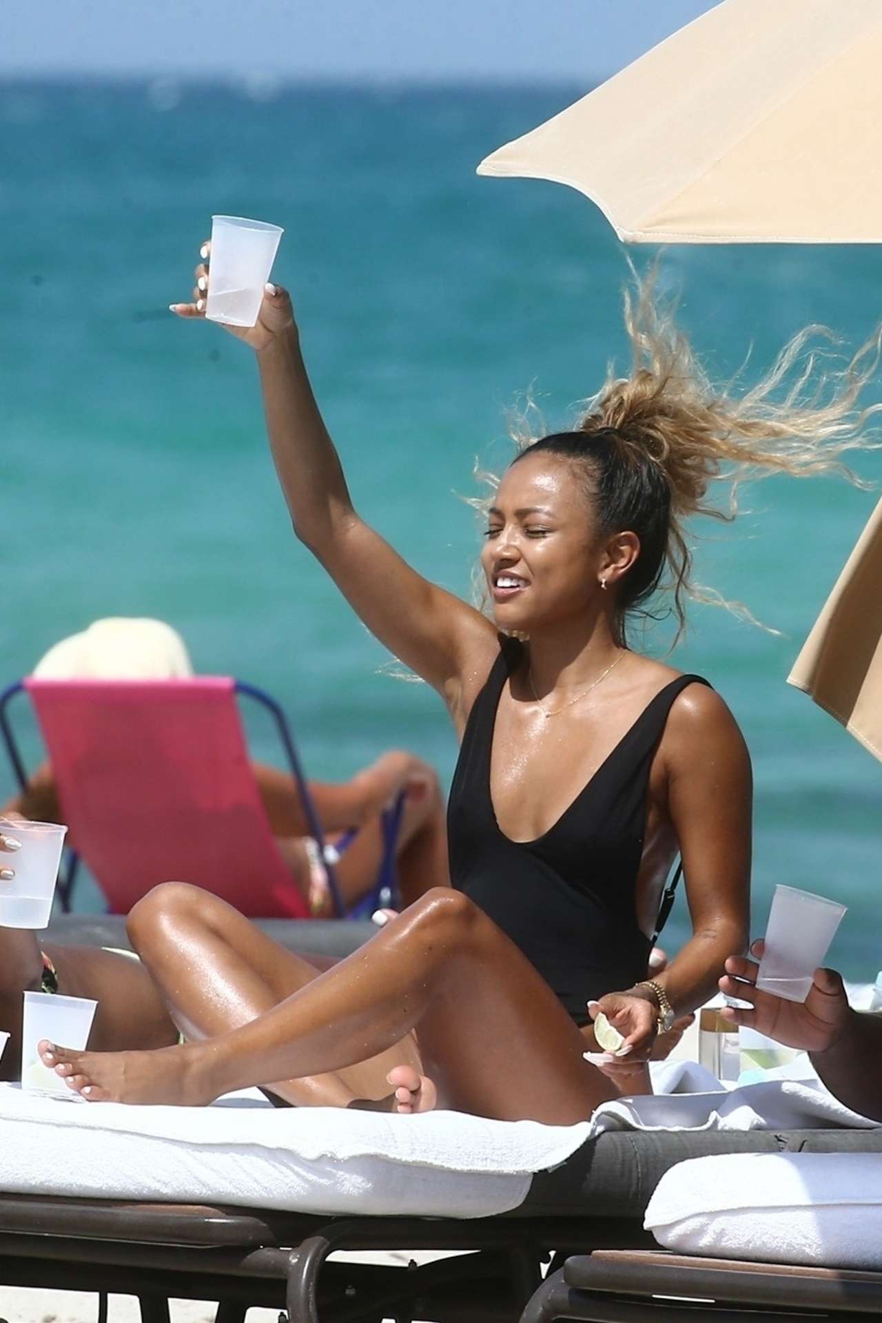 Miami Beach, FL – Karrueche Tran enjoys a drink as she soaks up the sun during a fun trip to the beach in Miami with friends. Karrueche, who’s currently starring as Virginia in TNT’s ‘Claws’ flaunted her curves in a black one piece, revealing all her hard work in the gym as the paparazzi snap away.