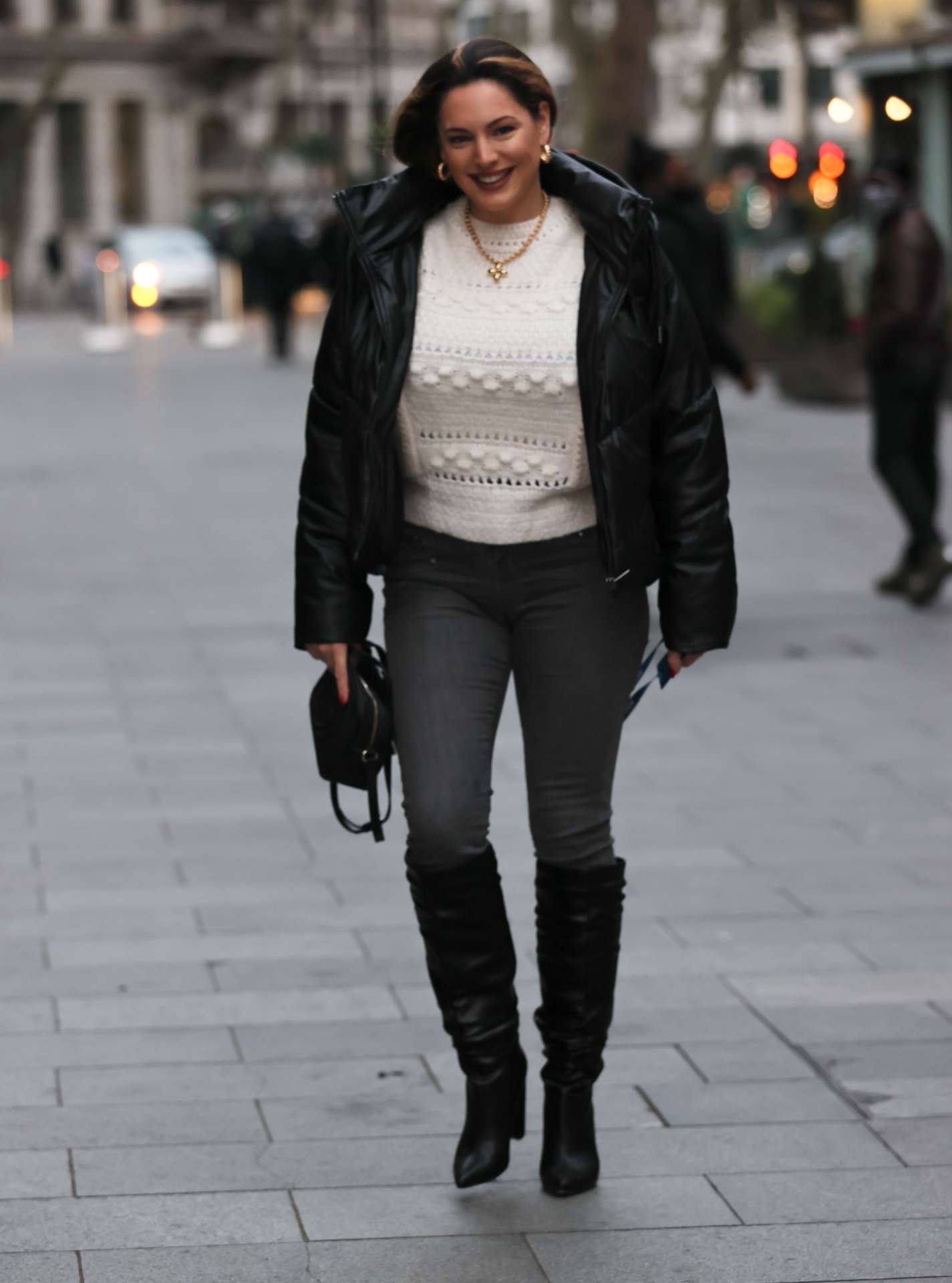 Kelly Brook at Heart radio in boots and tight denim