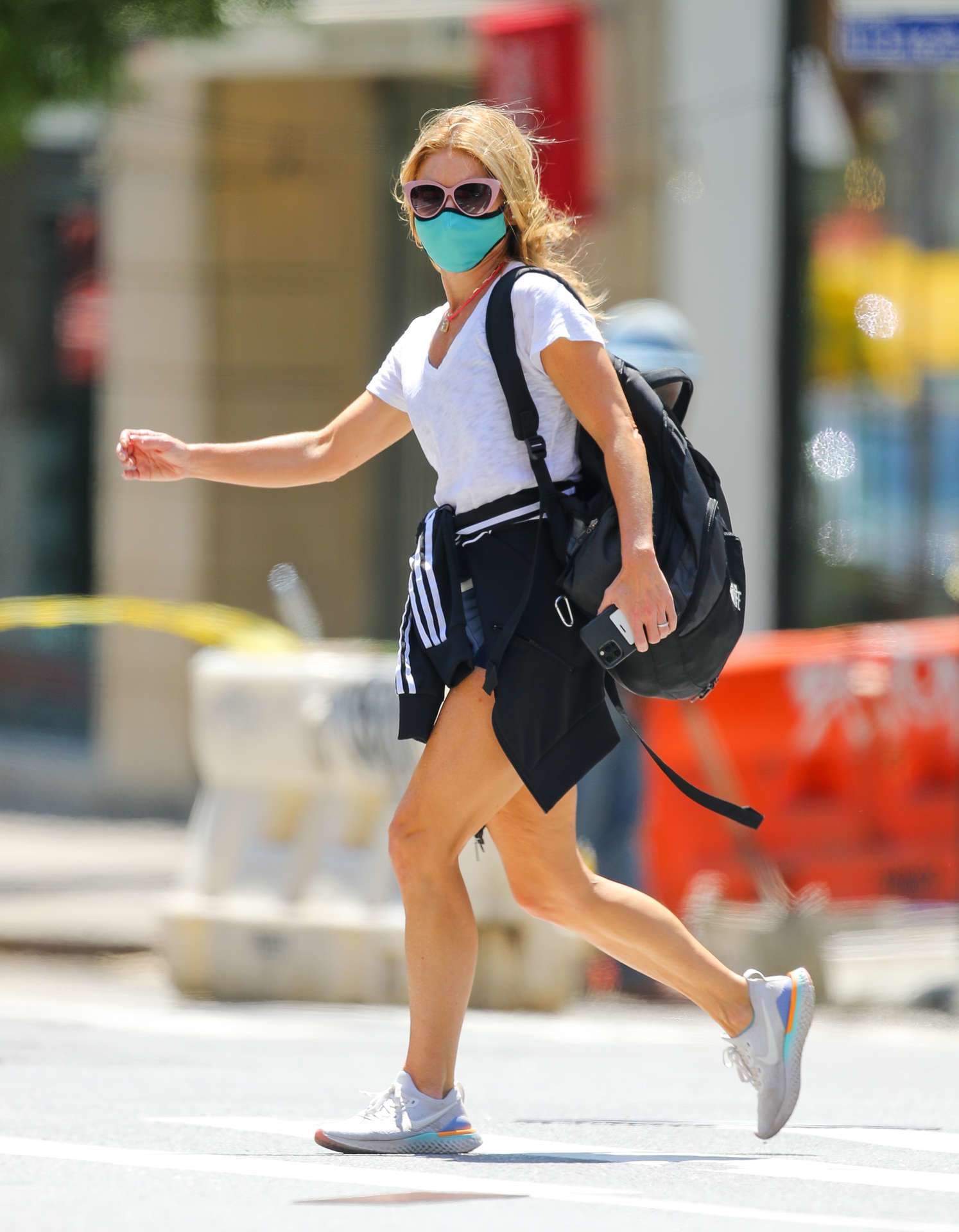 EXCLUSIVE: Kelly Ripa is spotted heading to the gym in New York City. The 50-year-old looks amazing as she takes long strides in her Nike sneakers. She has an Adidas tracksuit top tied around her waist as the weather took a warm turn this weekend.