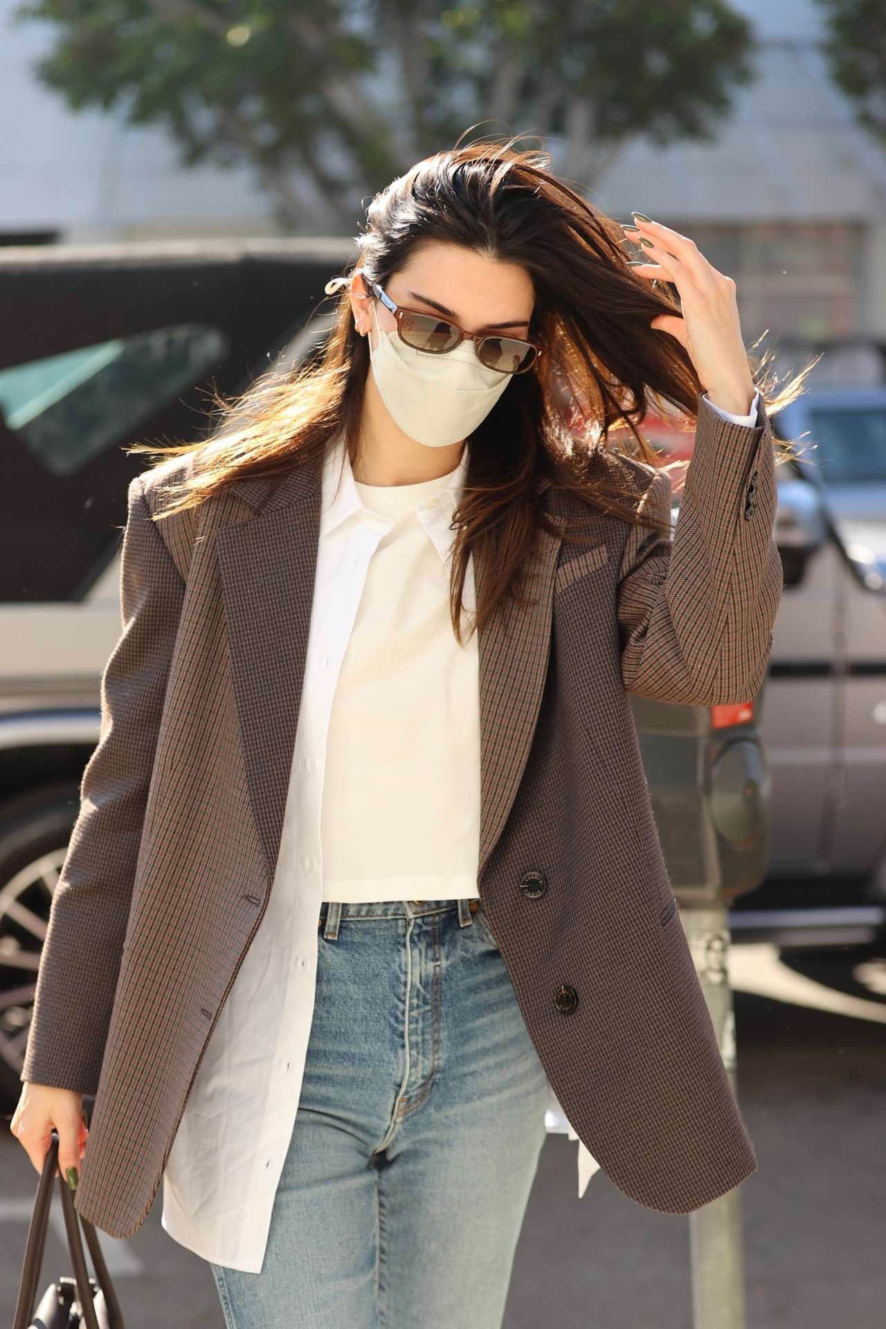 West Hollywood, CA – Model Kendall Jenner lets her hair blown in the wind as she steps out for lunch looking casual cool in a blazer with high waisted jeans.