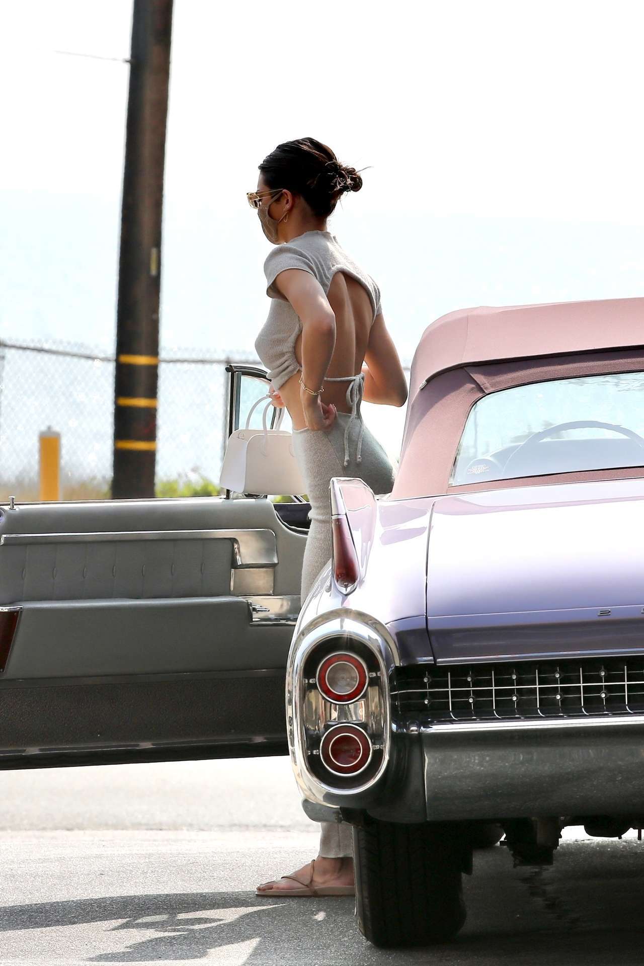 Malibu, CA – *EXCLUSIVE* – Supermodel Kendall Jenner makes a pit stop at a local gas station this afternoon while out taking her vintage Cadillac out for a drive. Kendall wore a sexy crop top with no back and form fitting matching bottoms with a face mask.