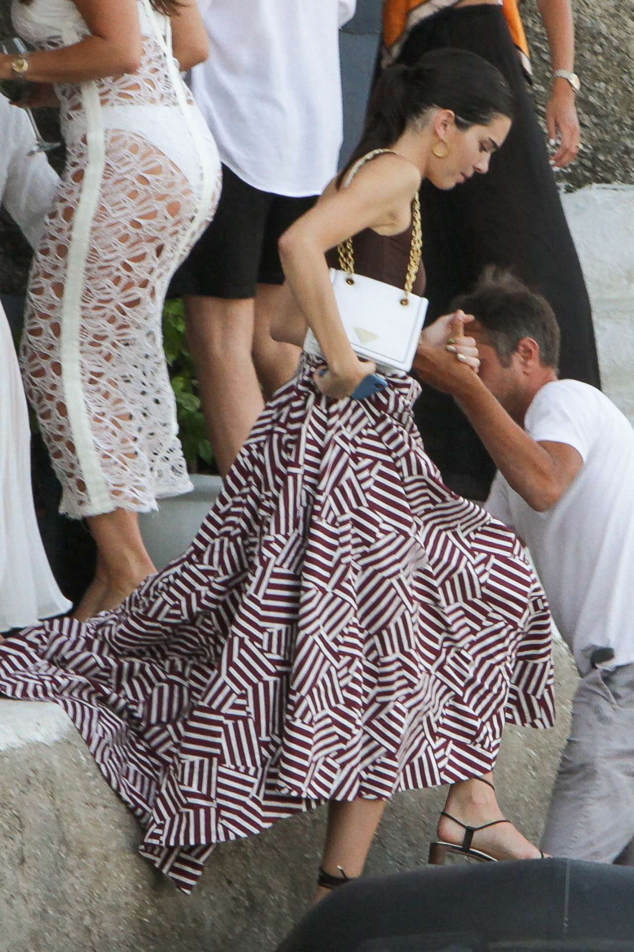 Kendall Jenner seens with friends to leave by speedboat a restaurant on Mykonos, Greece