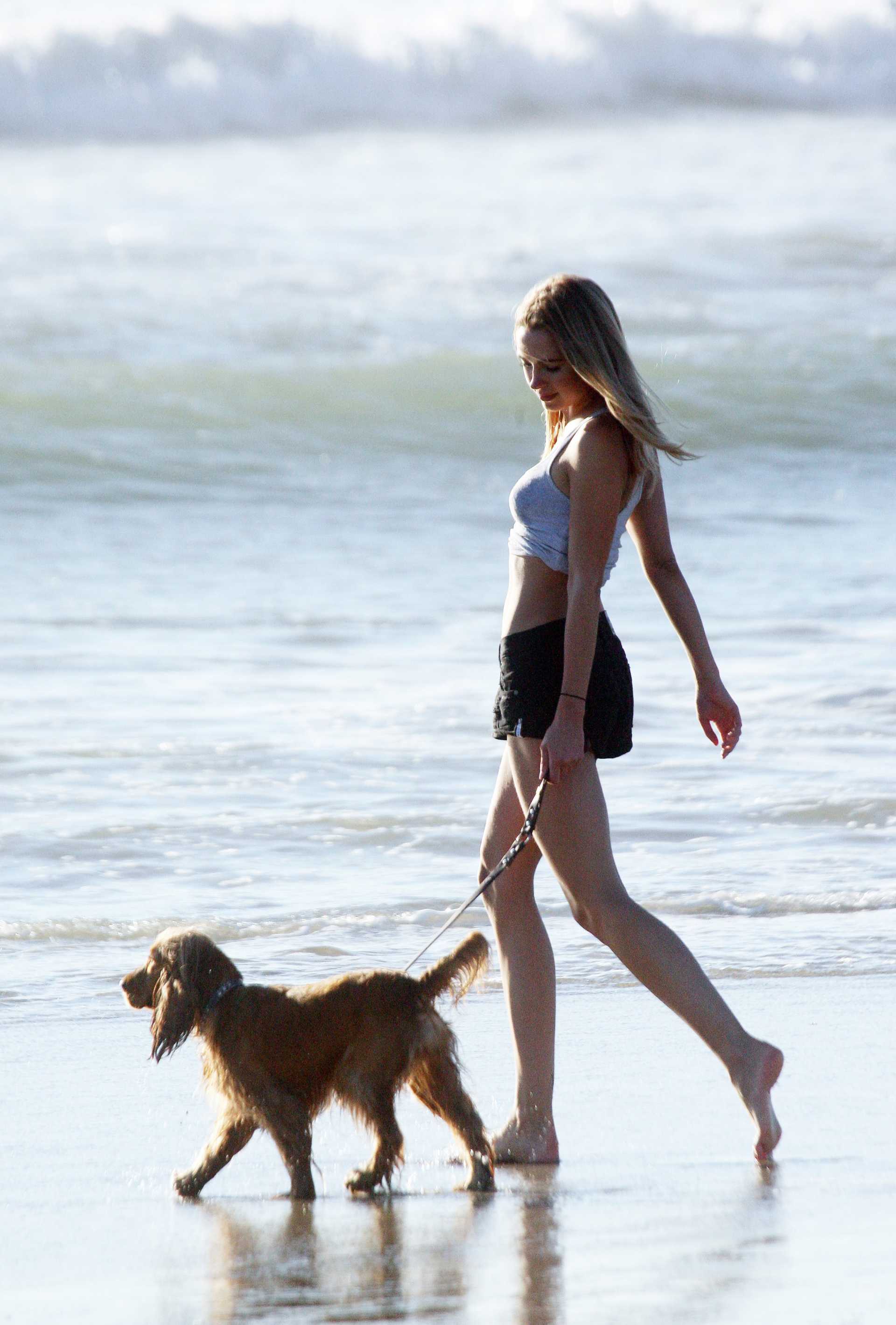 Kimberley Garner Taking her Dog Sasha for a Walk on the Beach in Santa Monica