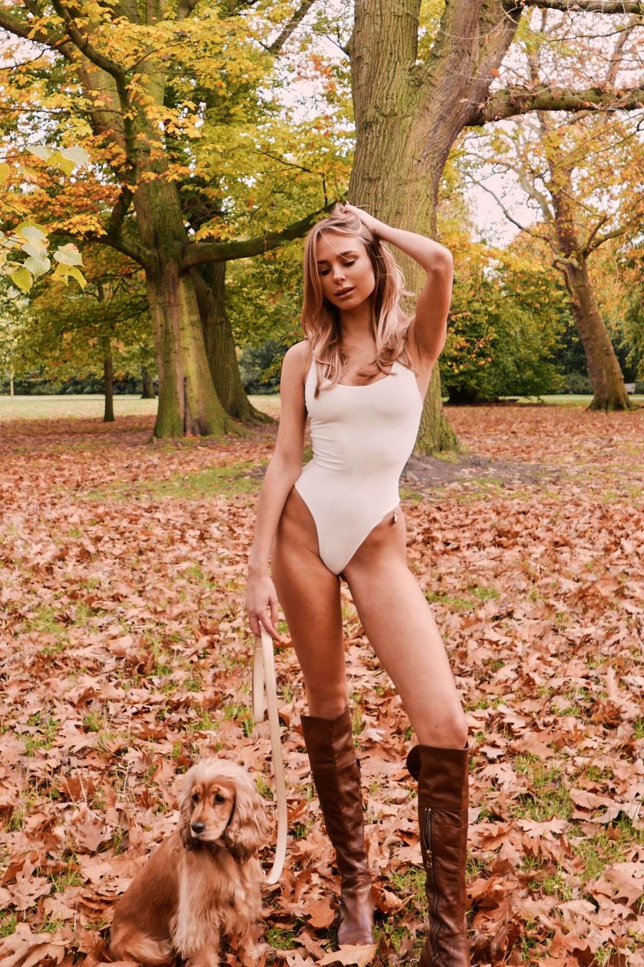 Attached to: Kimberley Garner Walking her Dog in a White Swimsuit in London’s Hyde Park