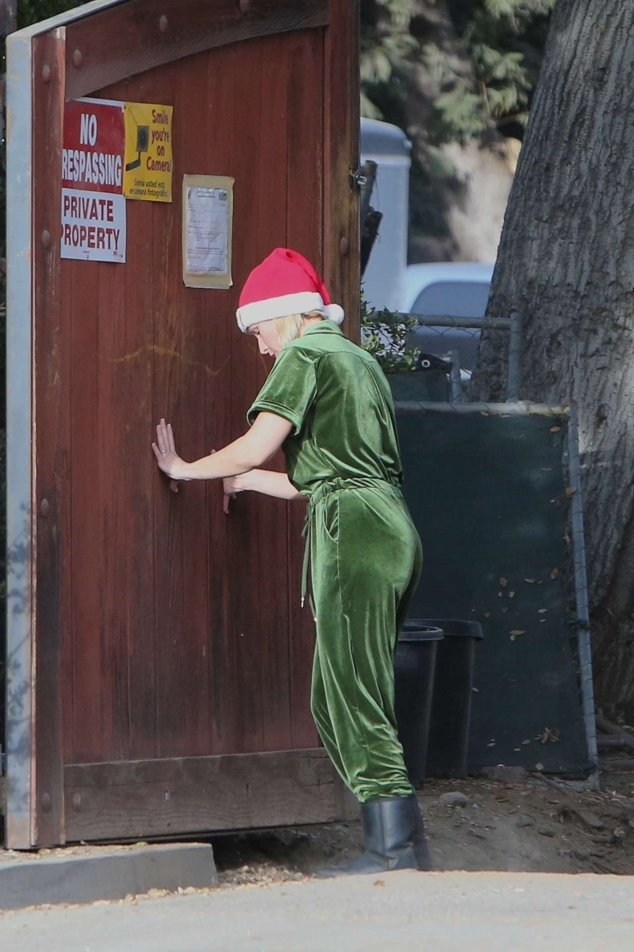 Los Angeles, CA – *EXCLUSIVE* Kristen Bell gets in the holiday spirit dressed in a green jumper and red Santa hat and bright red lipstick as she is spotted leaving her property in LA dressed for the holidays.