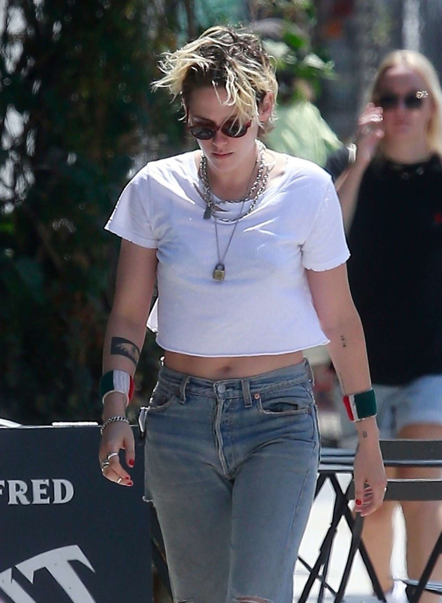 Los Angeles, CA – Actress Kristen Stewart is out in Los Angeles getting errands done. The actress dons a cropped white tee paired with distressed denim for the outing.