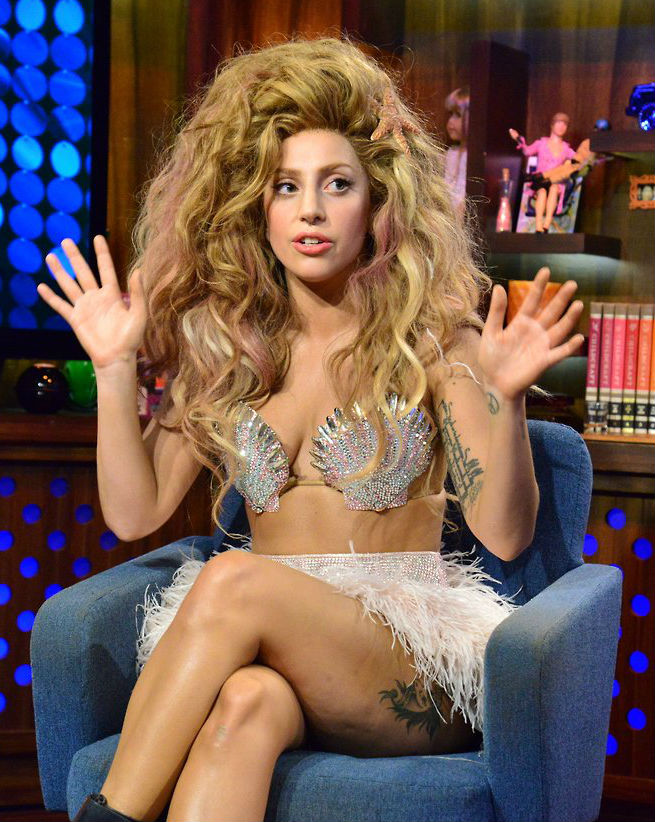 Lady Gaga in Clamshell Bikini Top and Miniskirt on Bravo Show