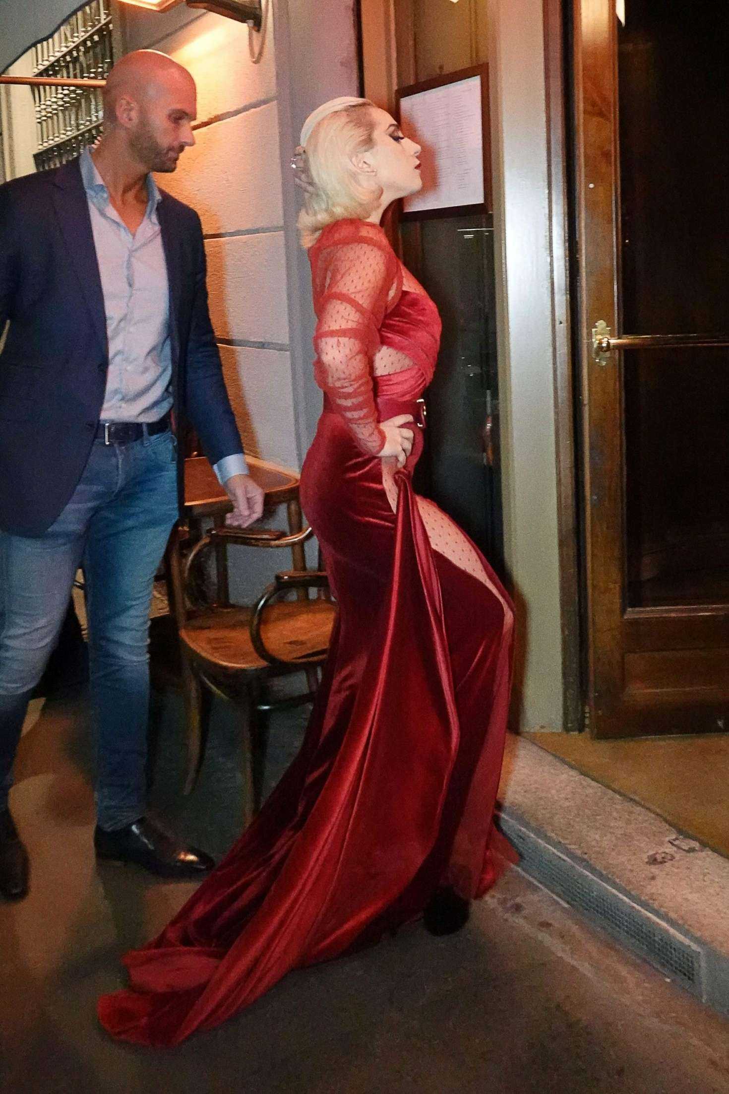 Lady Gaga in See-Through Red Dress Leaving her Hotel in Milan