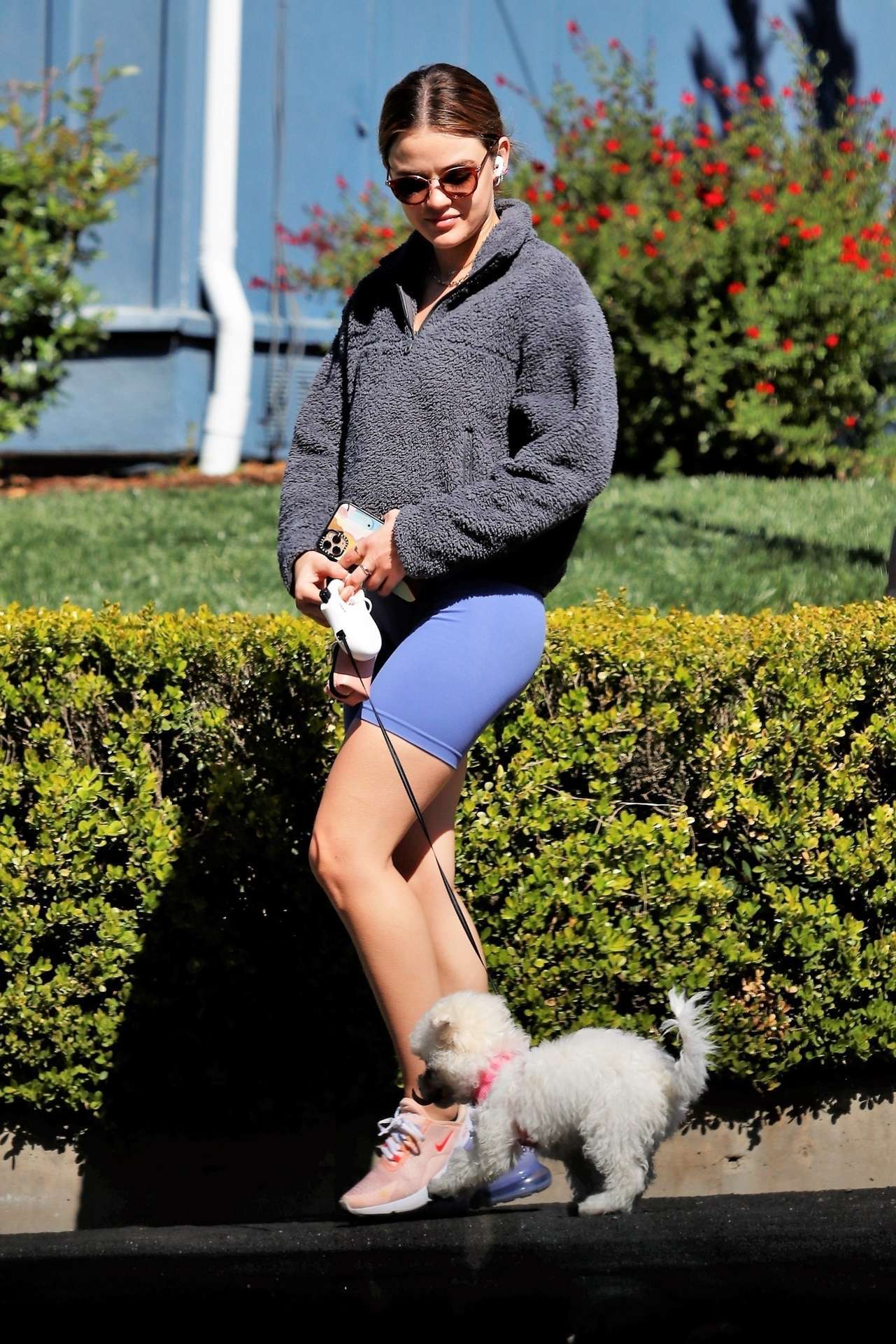 Los Angeles, CA – *EXCLUSIVE* – Actress Lucy Hale is out for a walk with her adopted puppy and the two look inseparable! Lucy donned a pair of biker shorts and sherpa quarter zip for the fresh outing.