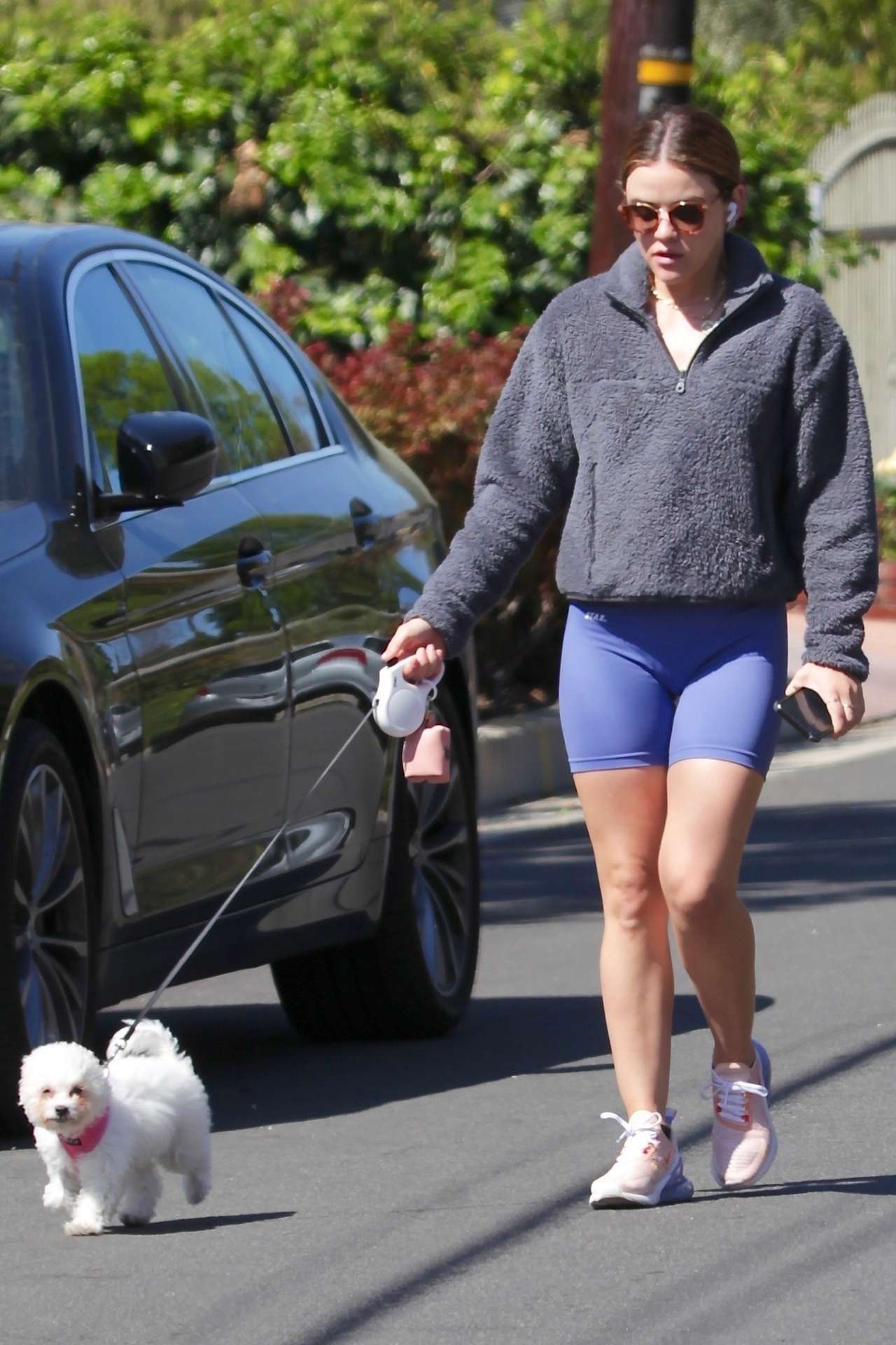 Los Angeles, CA – *EXCLUSIVE* – Actress Lucy Hale is out for a walk with her adopted puppy and the two look inseparable! Lucy donned a pair of biker shorts and sherpa quarter zip for the fresh outing.