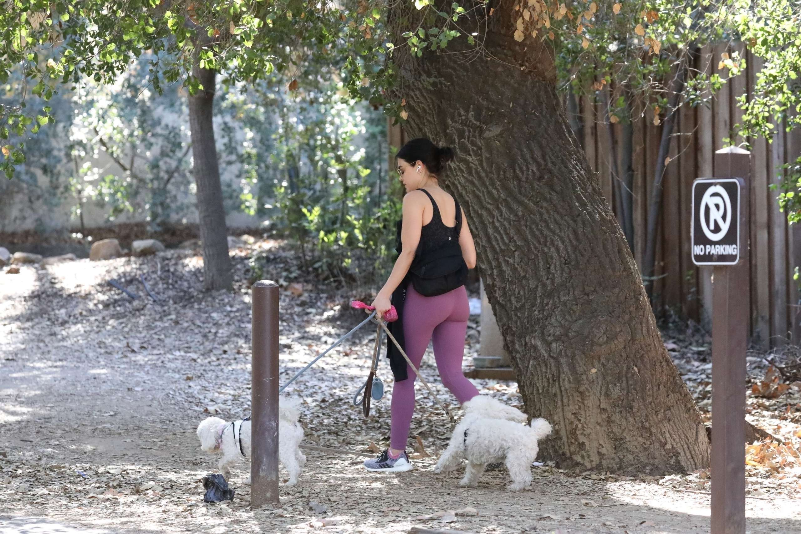Los Angeles, CA – *EXCLUSIVE* – Actress Lucy Hale heads to a park in Los Angeles to take her two pooches on a nature walk. Lucy gets dressed in mauve-colored yoga pants for the outing.