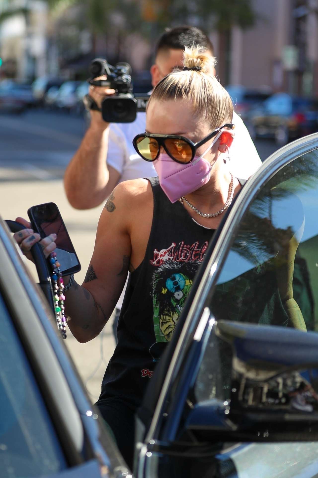 Beverly Hills, CA – *EXCLUSIVE* Miley Cyrus rocks a Motley Crue tee and leggings as she runs errands with her new rescue dog, Angel in Beverly Hills.