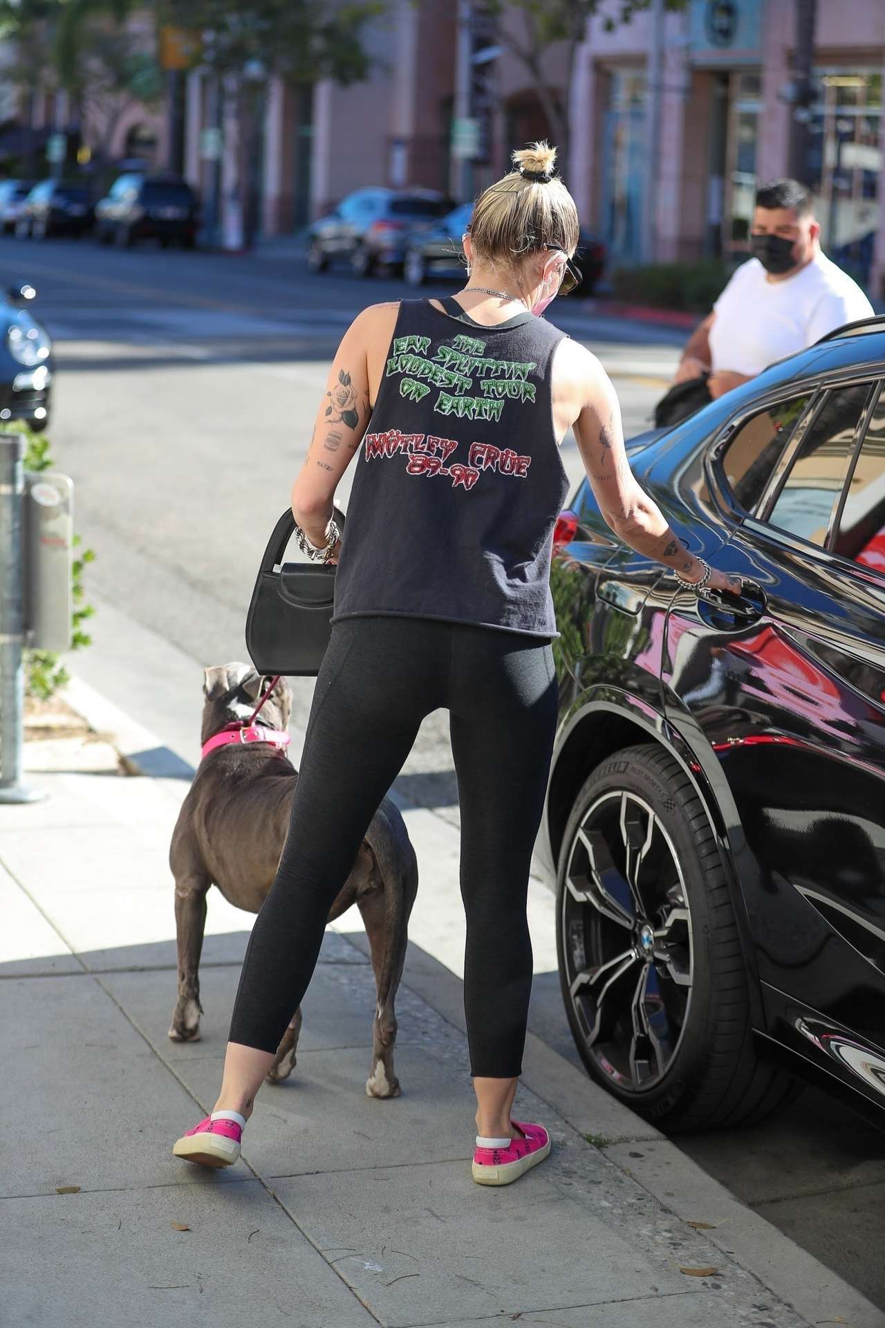 Beverly Hills, CA – *EXCLUSIVE* Miley Cyrus rocks a Motley Crue tee and leggings as she runs errands with her new rescue dog, Angel in Beverly Hills.